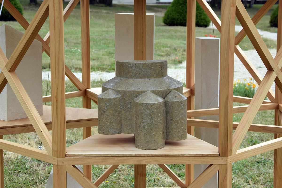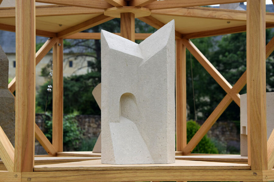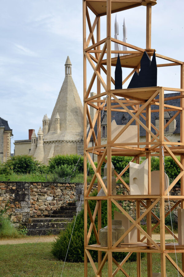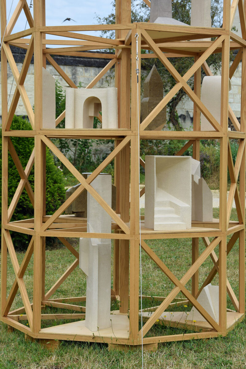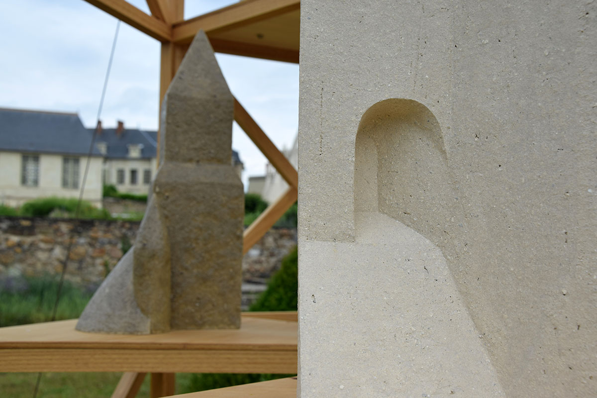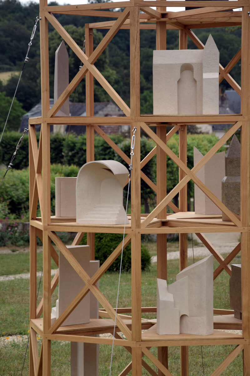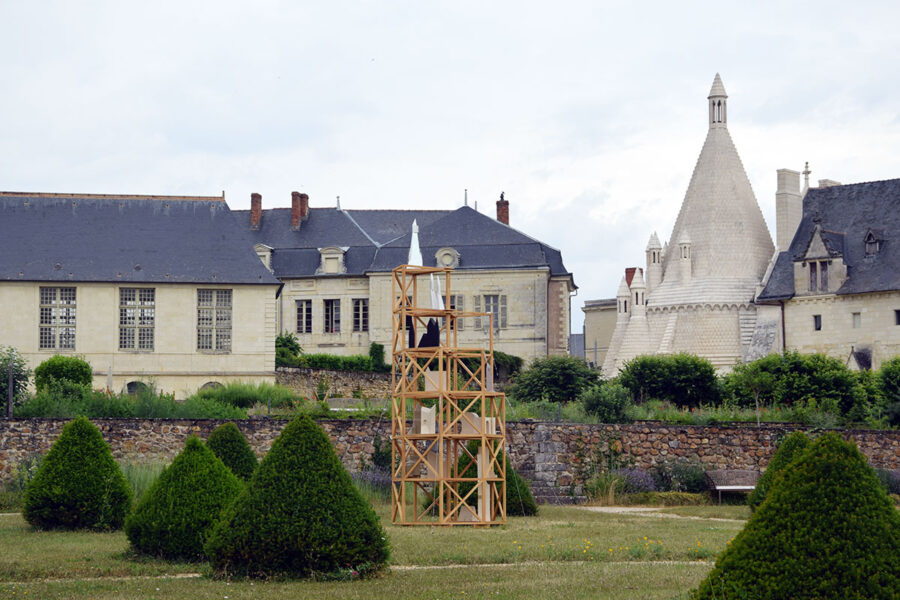 J’ai choisi d’habiter cette construction de plusieurs sculptures en céramique. Réalisées à partir d’un travail de collecte photographique puis de dessin, elles peuvent être issues d’éléments partiels ou entiers. Elles sont autant d’indices convoquant différentes échelles et plusieurs points de vue pris de l’Abbaye de Fontevraud, m’ayant intriguée par leur particularité. La plupart d’entre elles conservent un aspect brut qui rappelle le tuffeau, la pierre locale. Les sculptures les plus hautes possèdent un revêtement opalescent évoquant la nacre, un matériau employé dans les usines par les prisonniers confectionnant les boutons durant l’époque carcérale de l’Abbaye. Placées au plus haut de la structure, elles en sont le fanal. D’autres situées plus bas sont recouvertes d’un émail fait à base d’argile sédimentaire verte récoltée dans la forêt de Fontevraud à l’occasion d’une randonnée, s’inspirant du voeu de Robert d’Arbrissel d’être «enterré dans la boue de Fontevraud». La sculpture noire reprend la sombre silhouette des toits de l’abbatiale que je contemplais dans la lumière du levant depuis la chambre dans laquelle je logeais, située au-dessus de la porte d’entrée.