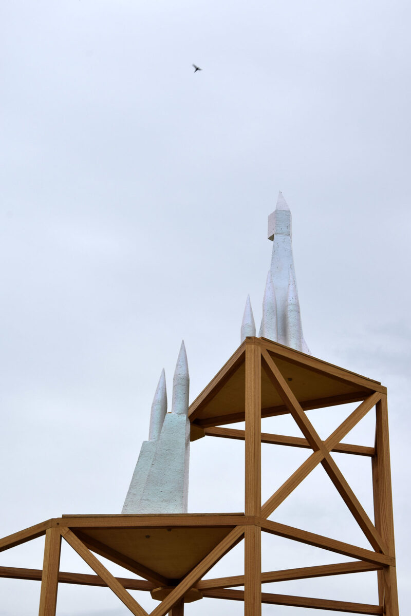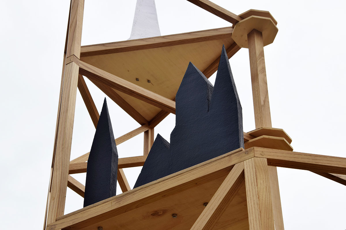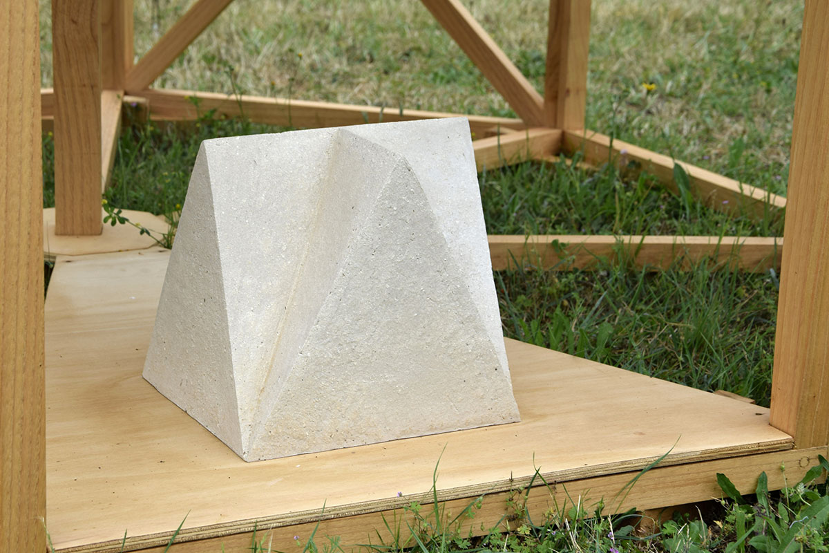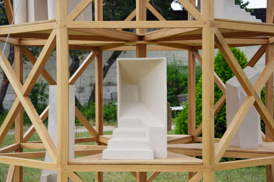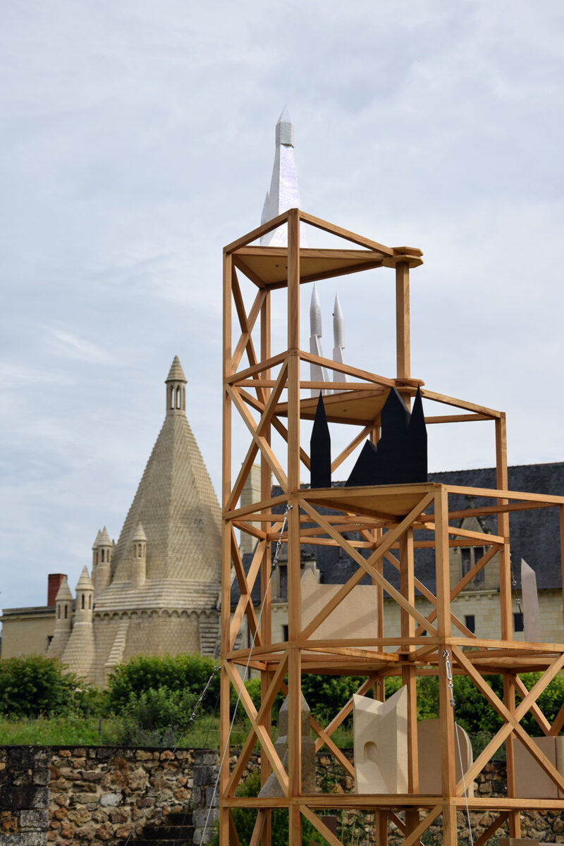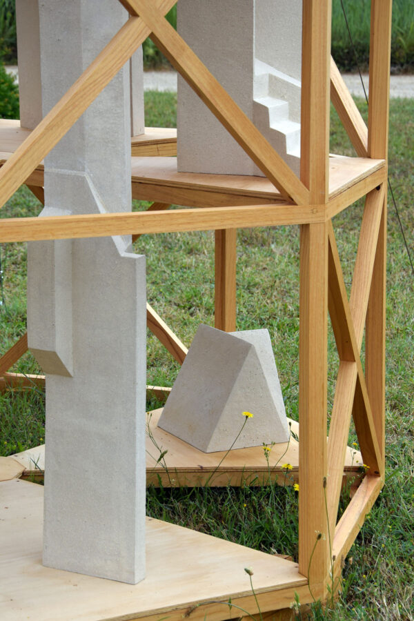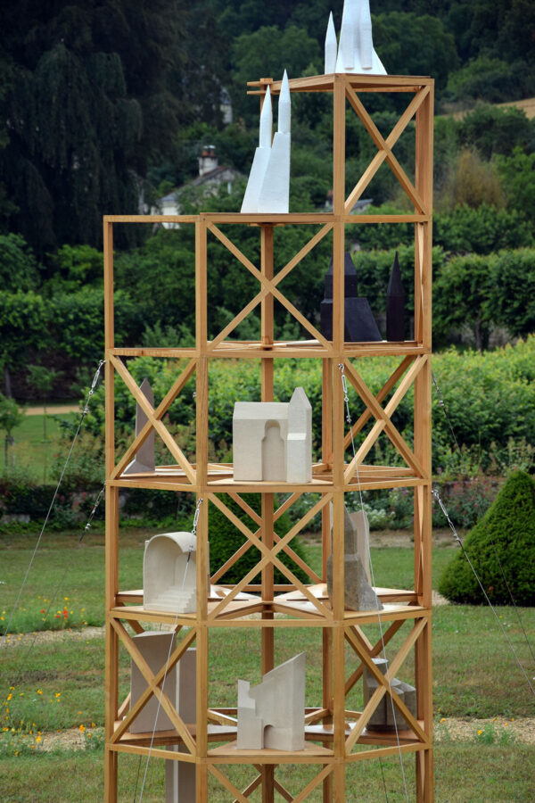 J’ai choisi d’habiter cette construction de plusieurs sculptures en céramique. Réalisées à partir d’un travail de collecte photographique puis de dessin, elles peuvent être issues d’éléments partiels ou entiers. Elles sont autant d’indices convoquant différentes échelles et plusieurs points de vue pris de l’Abbaye de Fontevraud, m’ayant intriguée par leur particularité. La plupart d’entre elles conservent un aspect brut qui rappelle le tuffeau, la pierre locale. Les sculptures les plus hautes possèdent un revêtement opalescent évoquant la nacre, un matériau employé dans les usines par les prisonniers confectionnant les boutons durant l’époque carcérale de l’Abbaye. Placées au plus haut de la structure, elles en sont le fanal. D’autres situées plus bas sont recouvertes d’un émail fait à base d’argile sédimentaire verte récoltée dans la forêt de Fontevraud à l’occasion d’une randonnée, s’inspirant du voeu de Robert d’Arbrissel d’être «enterré dans la boue de Fontevraud». La sculpture noire reprend la sombre silhouette des toits de l’abbatiale que je contemplais dans la lumière du levant depuis la chambre dans laquelle je logeais, située au-dessus de la porte d’entrée.