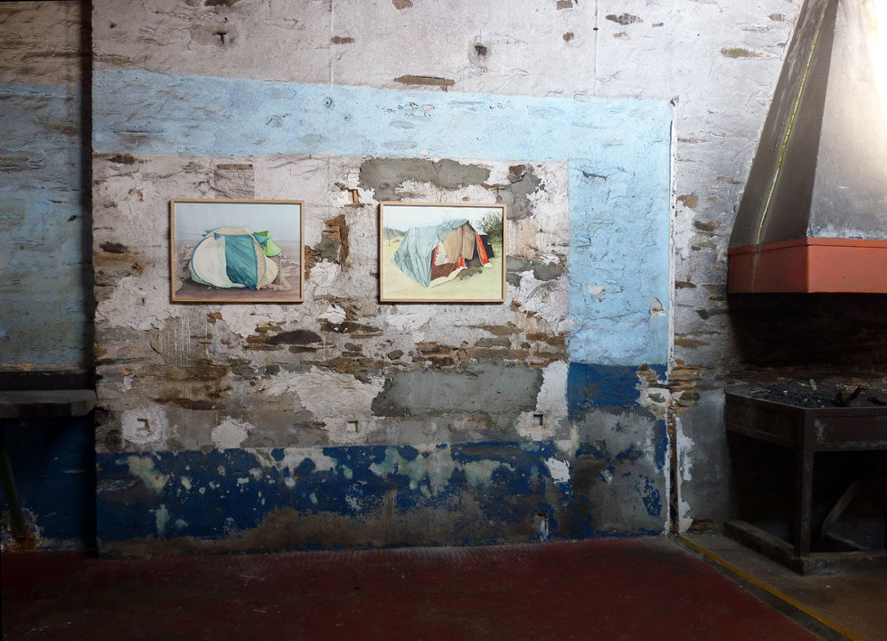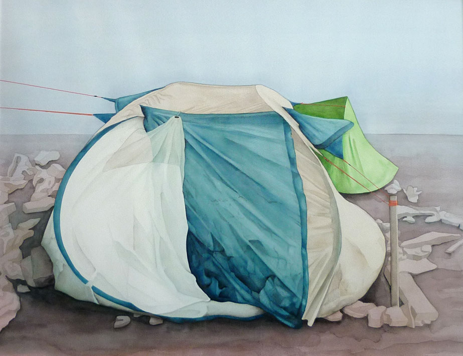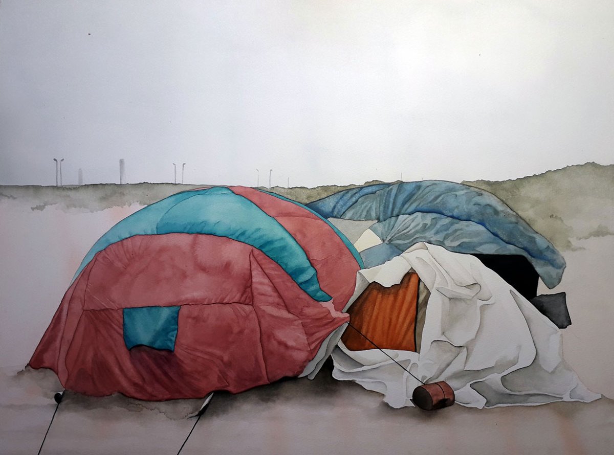 Tirées de photos de presse prises dans la jungle de Calais ou sous le périphérique parisien, ces aquarelles de tentes aux couleurs criardes sur fond de paysages indéfinis sont aussi bien prétextes à la peinture (composition colorée, drapé..) que constat ironique d’une transformation sociétale.