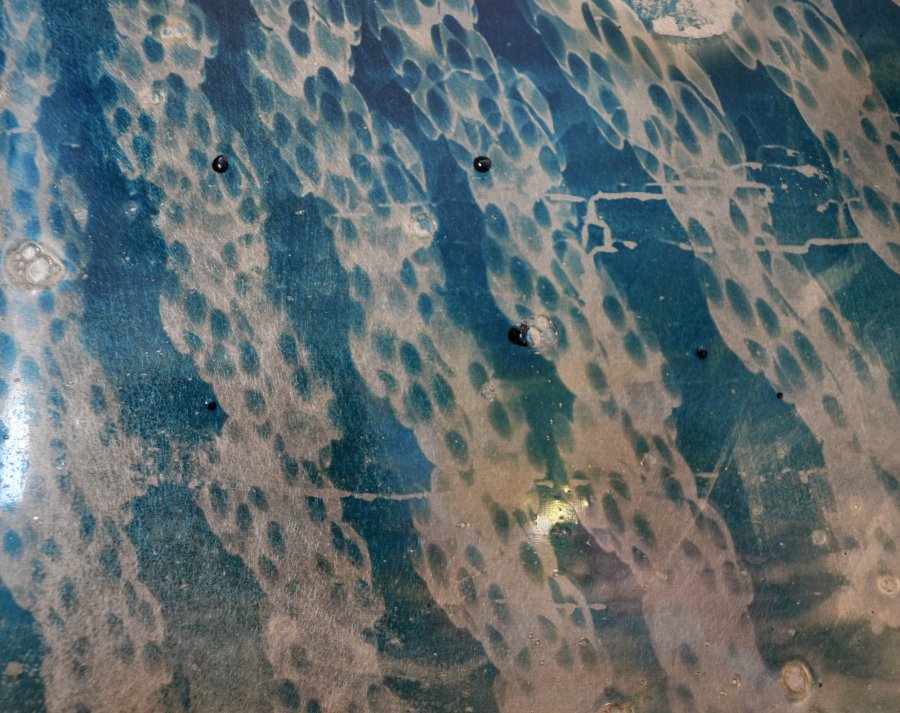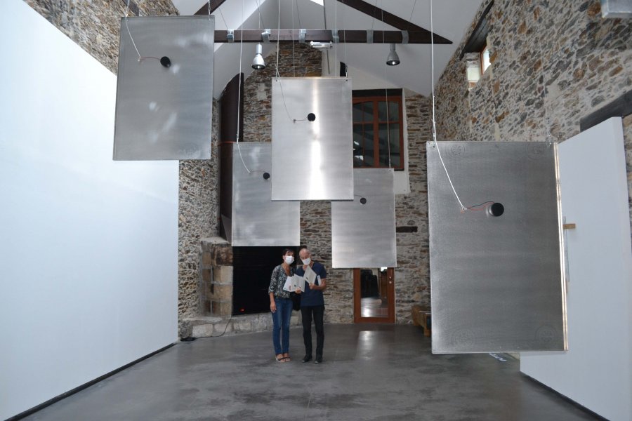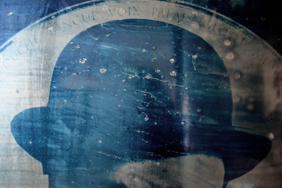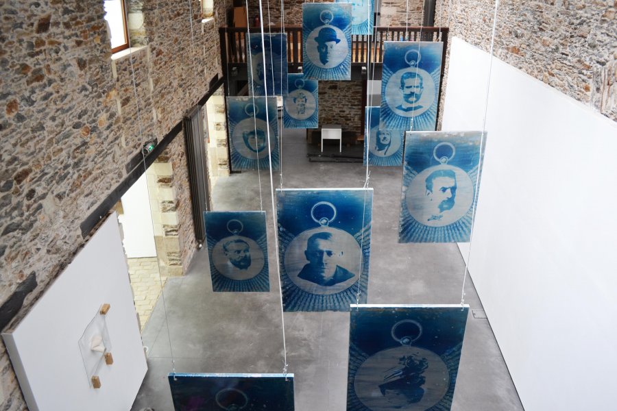 Blandine Brière rend hommage à ses « chantres » et propose une image empruntée aux livres d’histoire qu’elle cristallise dans une médaille. Elle utilise le cyanotype qui conserve l’empreinte par simple contact avec l’objet posé sur des supports préparés chimiquement. Une technique, au départ scientifique, mise au point en 1842 par l’astronome anglais John Frederick William Herschel. Blandine Brière fait les choix des matières: la gélatine est un matériau principalement composé de collagène, c’est la protéine structurale la plus importante de notre corps qui constitue notre peau et nos os mis au contact de la carlingue de leurs montures représentées par ces plaques de métal brossées. Pour l’artiste, la trace laissée par le cyanotype, cette trace évanescente, les portraits des premiers pionniers de l’aviation et de leurs premiers contrails dans le ciel, sont comme celles, peut-être, éphémères d’une œuvre dans un espace d’exposition. Blandine Brière travaille sur la spatialisation du son avec les 12 hauts parleurs, chacun diffusant un son particulier. Elle réalise le mixage sur place en prenant en compte la résonance, l’acoustique et l’espace de l’exposition. La création sonore accompagne ces héros d’applaudissements, de réprobation de foule, des rires de ces oiseaux solitaires et de silences finissant en queue de réverbération.
