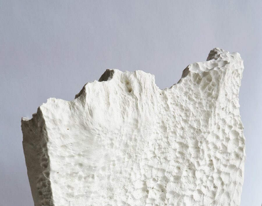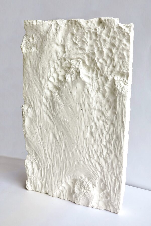 A l’image d’un sculpteur qui taillerait dans un bloc de marbre, un bloc de plâtre est déposé dans la rivière. Au fur et à mesure du temps et sur une durée de cinq jours, l’eau s’est mise à sculpter, creusant dans le plâtre et laissant l’empreinte de ses mouvements.
