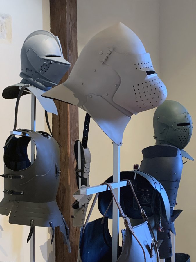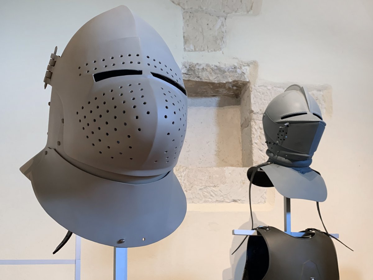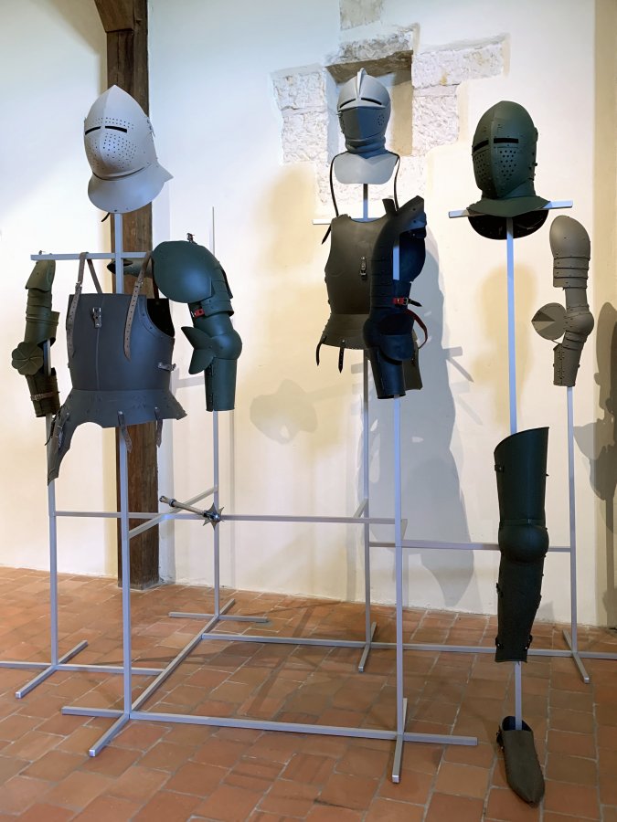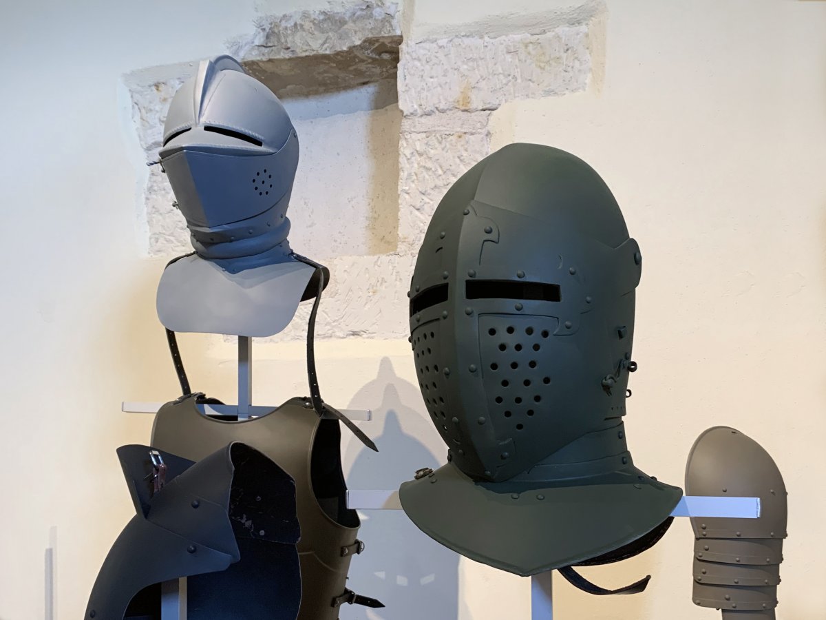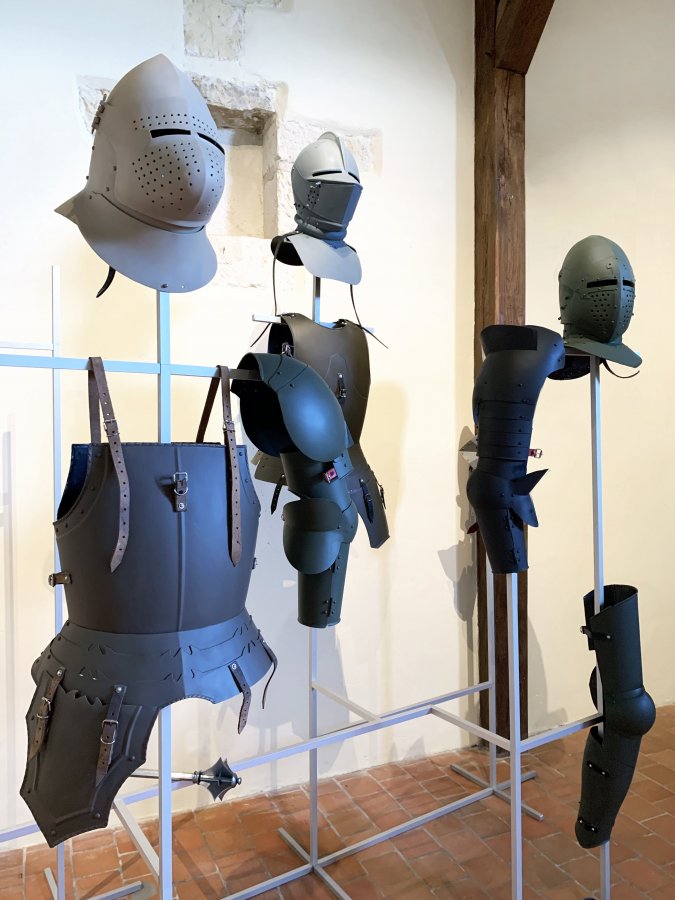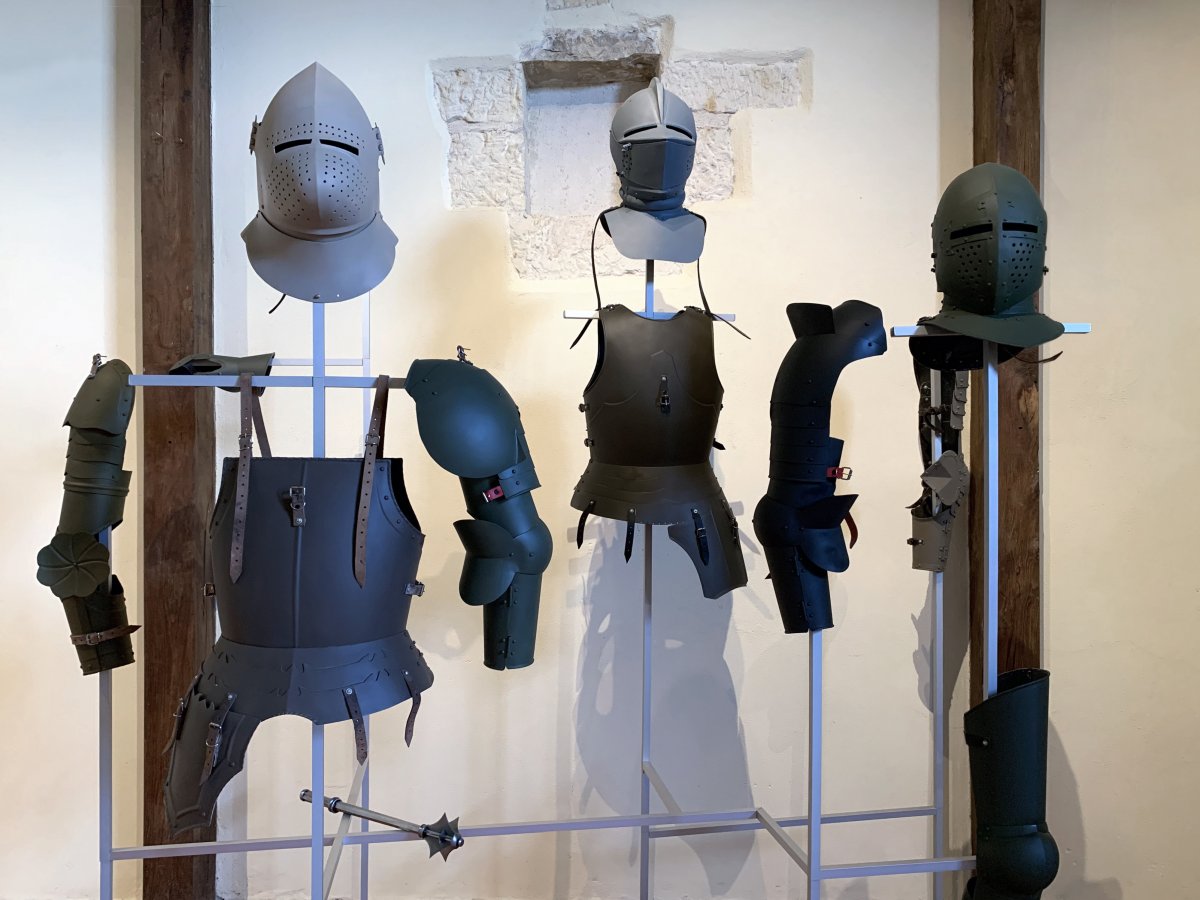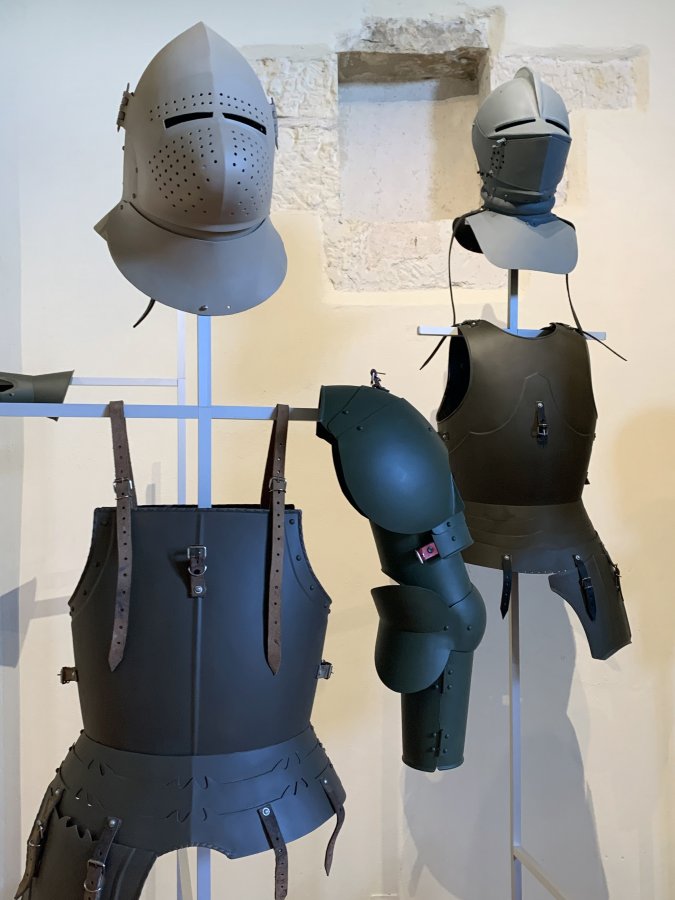 Composée d’éléments d’armures médiévales repeints et agencés sur un réseau de lignes métalliques, l’installation s’apparente à une présentation entre scénographie muséale et vitrine de commerce.