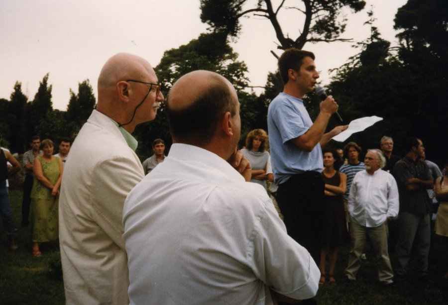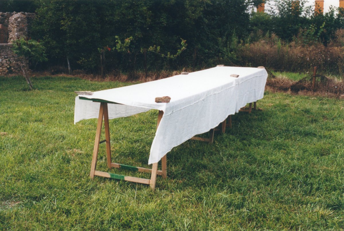 Ce mois d’août, l’événement aura lieu sur le mode bachique à Talairan, petit village des Corbières. En effet, le projet Eva, Eva, initié par Laurent Moriceau en 1996 entre dans une nouvelle étape de son processus sans fin d’invitation au partage. Après avoir bu amoureusement et à plusieurs, le volume du corps d’Eva, son aimée, Laurent Moriceau propose à d’autres de développer de désir de cette joyeuse libation. Séduit par l’enjeu, Annie et Jean-Pierre Mazard sont les nouveaux maîtres de la fête, nous conviant à l’absorption métaphorique de l’équivalent du corps de leur fille Marie-Pierre, incarnée en un vin de leur cru conçu comme un véritable portrait. L’action sera aussi simple et sobre que symbolique, désavouant l’incommunicabilité de l’amour par l’extériorité même de son intimité. L’univers symbolique en appelle donc savoureusement à l’autre comme témoin de cet autre irréductible à l’image. Privilégiant la convivialité et la communion charnelle, cette action est proche des rites archaïques d’incorporation, au croisement de la parole, de la représentation et du rêve accessible. L’esprit du désir se manifestera de la sorte pour construire ce corps sensuel d’un instant sacrifié dans une forme collective. Traversées par l’axe amoureux, ces festivités articulent en filigrane les mouvements antagonistes, de la pulsion et de la scansion du temps, du dedans et du dehors, du fantasme et du plaisir, de la violence et de la légèreté. Le dépassement de ces limites substitue ainsi à l’isolement de l’être un sentiment de continuité profonde. Pour une fois, la consommation rassemble pour une communion du cœur. À ce moment précis et sous une forme peu spectaculaire, l’acte esthétique prend en charge l’interdit dans le jeu des échanges. La communauté est dès lors ce qui nous arrive, faisant l’expérience du partage, dans l’inachèvement de son partage.