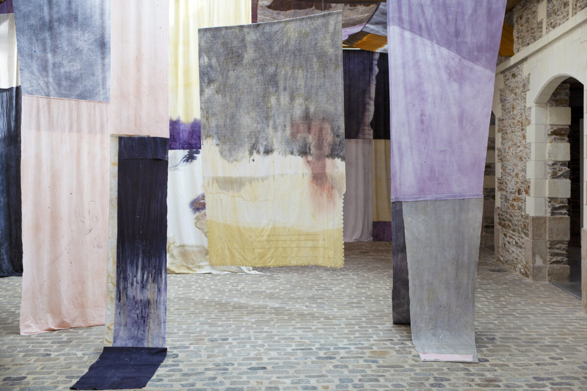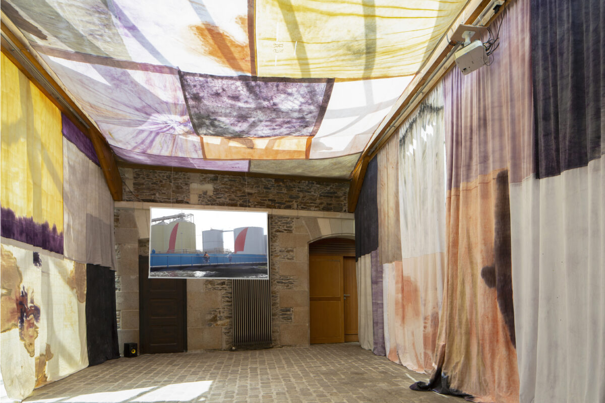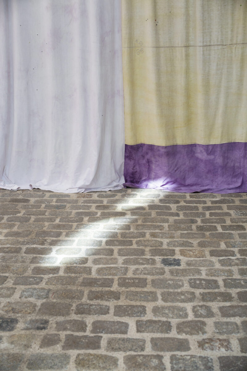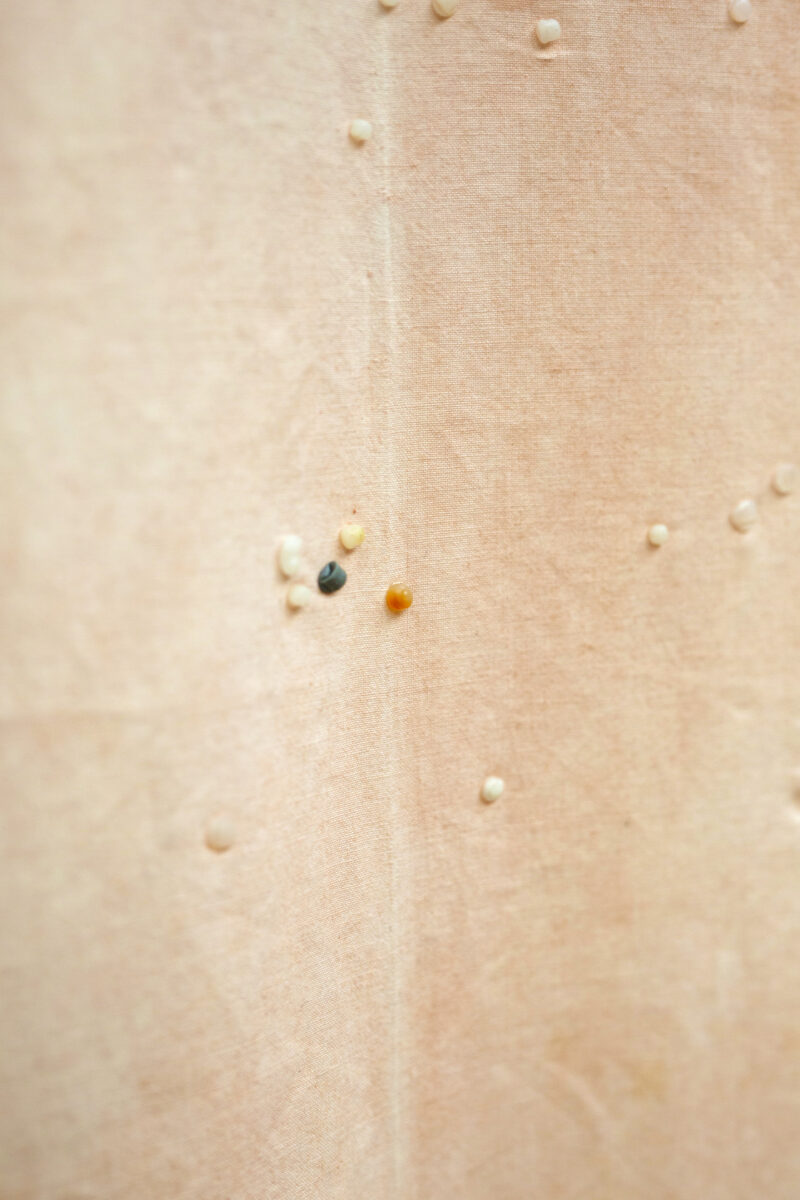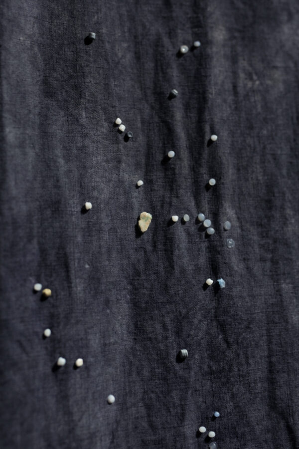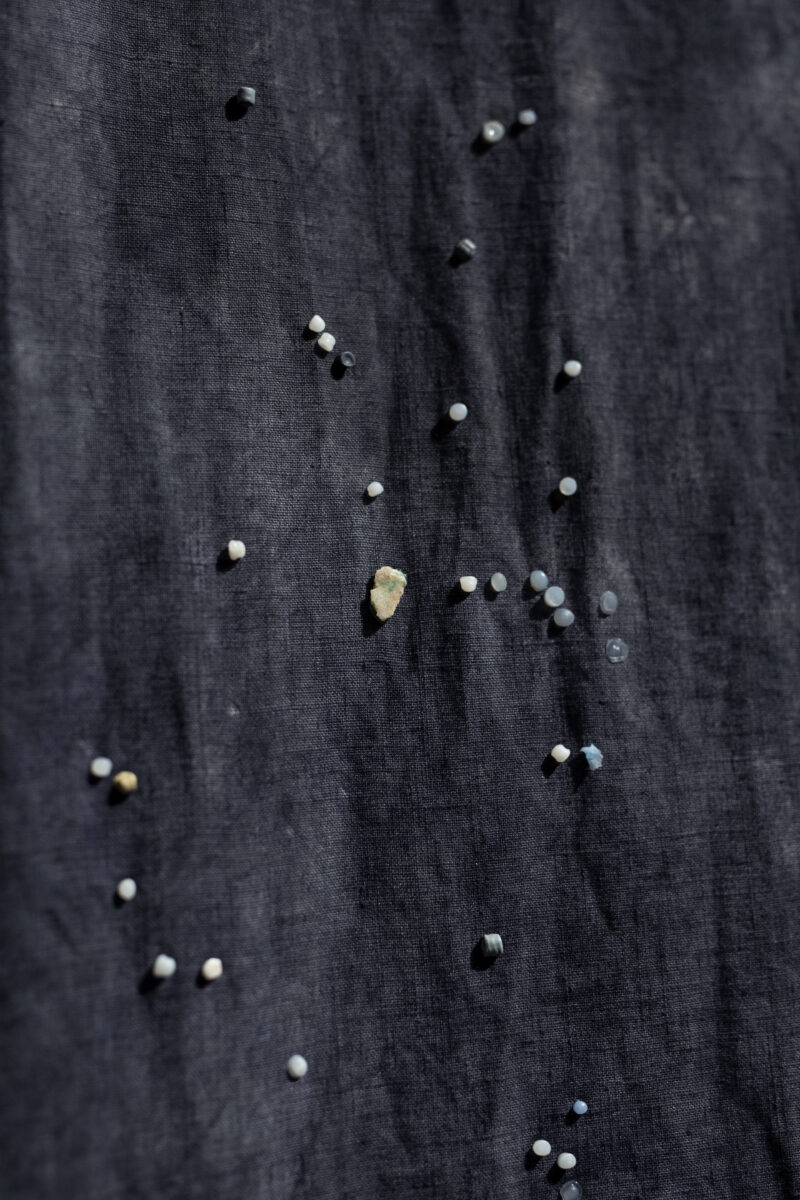 Claire Amiot : La question de la crise climatique et les enjeux écologiques qu’elle soulève, qu’ils soient sociaux, économiques, moraux ou environnementaux, ne peuvent pas échapper aux artistes et au milieu de l’art en général. À mon échelle, j’essaie d’inclure ces réflexions dans mon processus de création et dans l’origine des matériaux que j’utilise. Pour l’installation Les nappes silencieuses, les tissus utilisés sont des draps de seconde main, teints à partir de végétaux que je me procure auprès d’une Scop, qui cultive ses propres plantes tinctoriales. En octobre dernier, avec mon amie artiste Blanche Bonnel, nous avons pu constater l’étendue dramatique de la pollution au GPI (Granulés Plastiques Industriels) sur plusieurs plages en Bretagne. Grâce au soutien de l’association Surfrider, nous avons pu en récolter une quantité importante. De là, est née l’idée d’utiliser cette matière synthétique comme un élément pictural en soi, et de la faire dialoguer avec des couleurs végétales. Dans Les nappes silencieuses, un renversement s’opère. Les GPI, nuisibles dans notre environnement, deviennent ici ornements. Les expériences phénoménologiques des paysages que j’éprouve constituent le point de départ de mes recherches et réflexions. Que ce soit à travers la peinture, l’installation, le son ou la vidéo, je tente d’établir un dialogue onirique entre des matières ou des images issues de la nature, et des éléments artificiels. Je cherche à révéler les failles et les souffrances de nos paysages en créant des formes contemplatives et en jouant avec la sensualité des matériaux qui sont les miens.