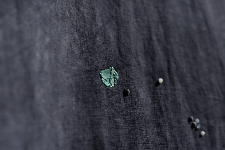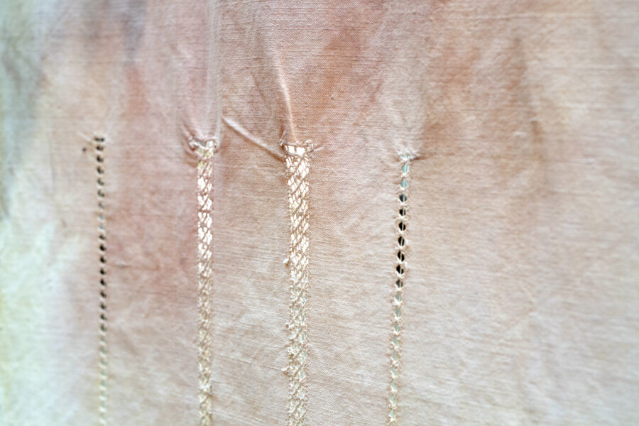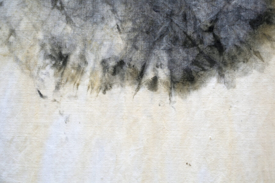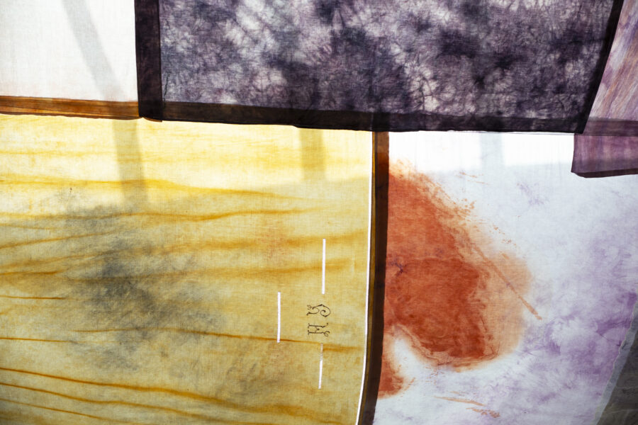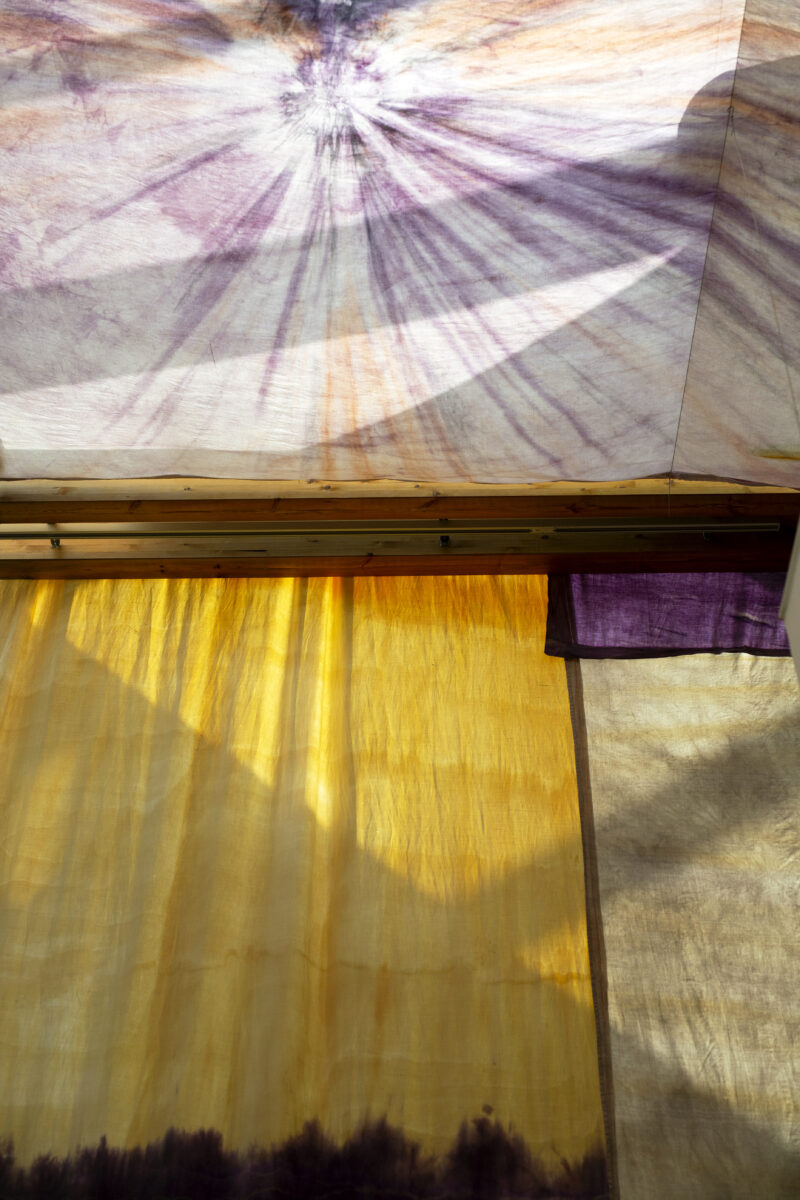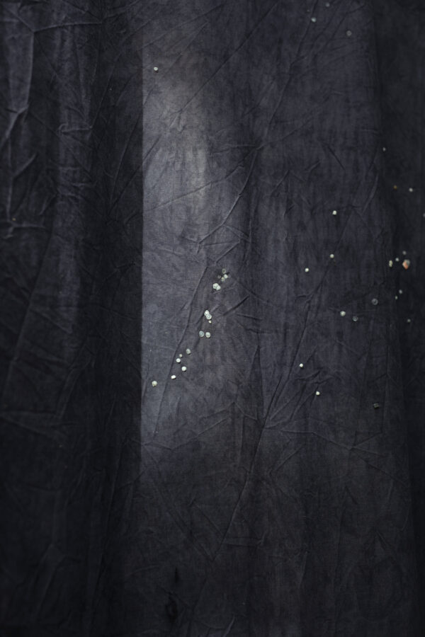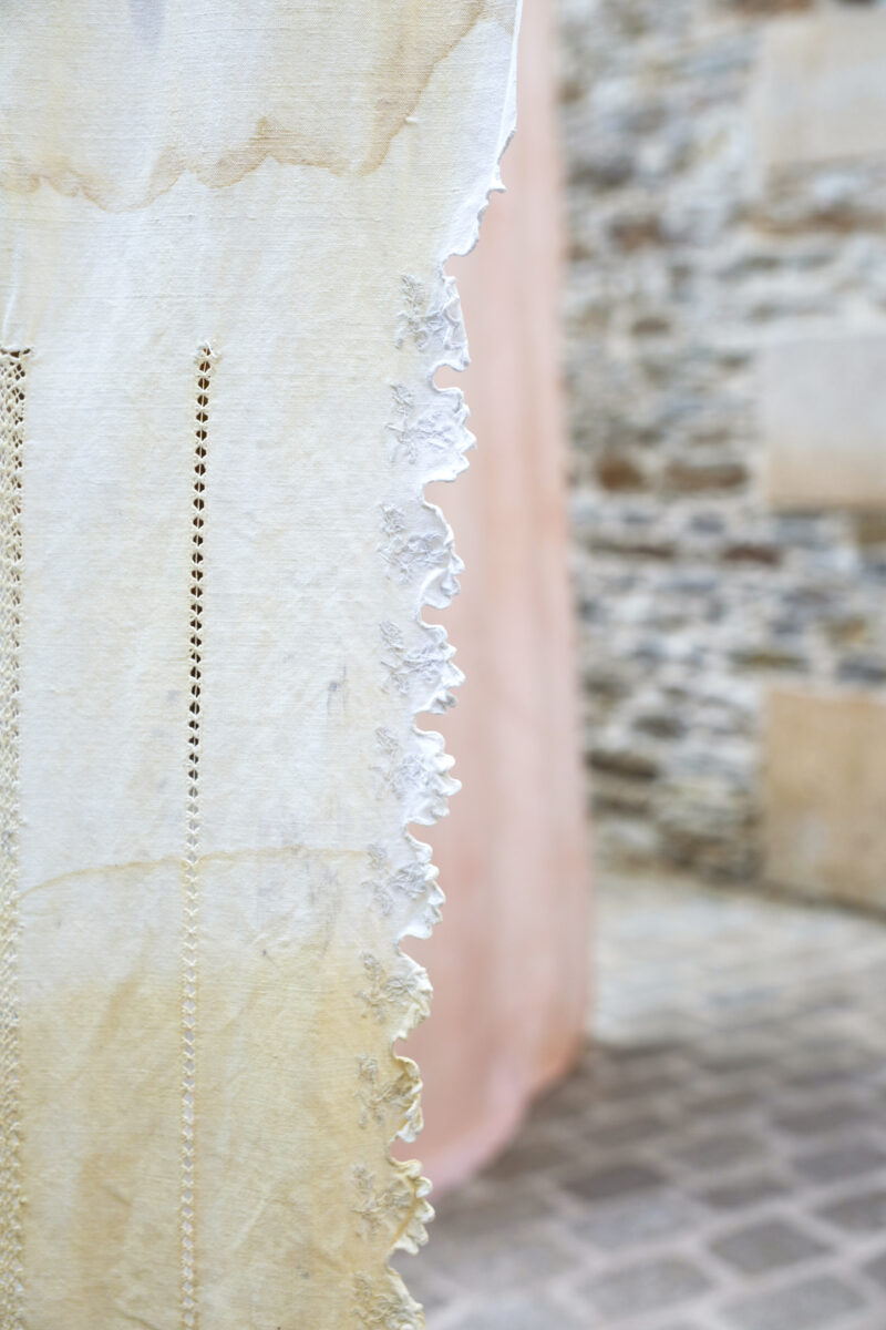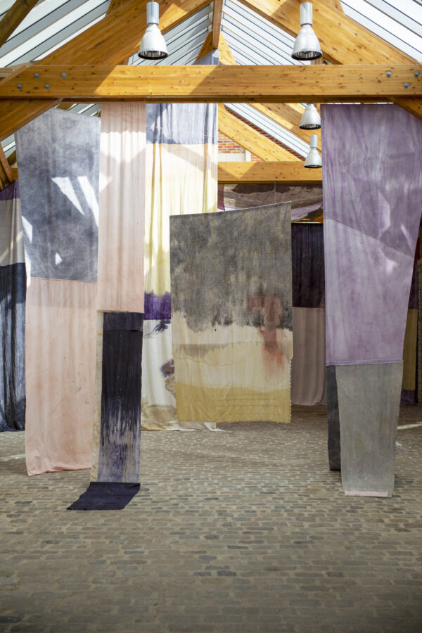 Claire Amiot : La question de la crise climatique et les enjeux écologiques qu’elle soulève, qu’ils soient sociaux, économiques, moraux ou environnementaux, ne peuvent pas échapper aux artistes et au milieu de l’art en général. À mon échelle, j’essaie d’inclure ces réflexions dans mon processus de création et dans l’origine des matériaux que j’utilise. Pour l’installation Les nappes silencieuses, les tissus utilisés sont des draps de seconde main, teints à partir de végétaux que je me procure auprès d’une Scop, qui cultive ses propres plantes tinctoriales. En octobre dernier, avec mon amie artiste Blanche Bonnel, nous avons pu constater l’étendue dramatique de la pollution au GPI (Granulés Plastiques Industriels) sur plusieurs plages en Bretagne. Grâce au soutien de l’association Surfrider, nous avons pu en récolter une quantité importante. De là, est née l’idée d’utiliser cette matière synthétique comme un élément pictural en soi, et de la faire dialoguer avec des couleurs végétales. Dans Les nappes silencieuses, un renversement s’opère. Les GPI, nuisibles dans notre environnement, deviennent ici ornements. Les expériences phénoménologiques des paysages que j’éprouve constituent le point de départ de mes recherches et réflexions. Que ce soit à travers la peinture, l’installation, le son ou la vidéo, je tente d’établir un dialogue onirique entre des matières ou des images issues de la nature, et des éléments artificiels. Je cherche à révéler les failles et les souffrances de nos paysages en créant des formes contemplatives et en jouant avec la sensualité des matériaux qui sont les miens.