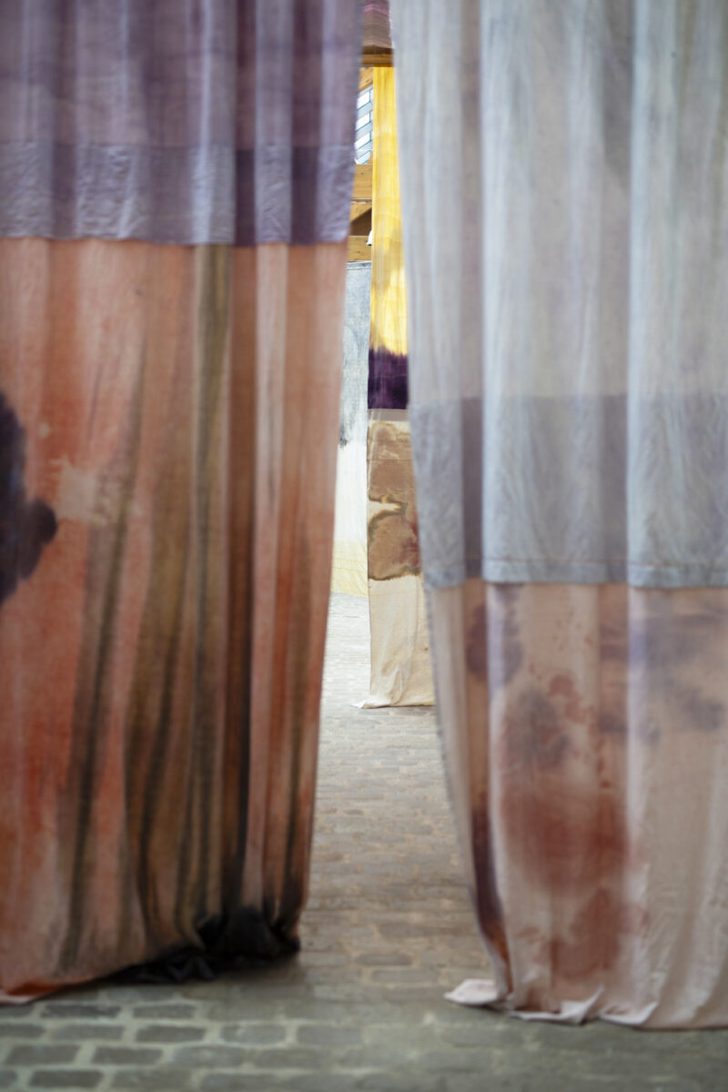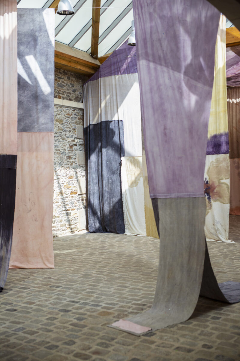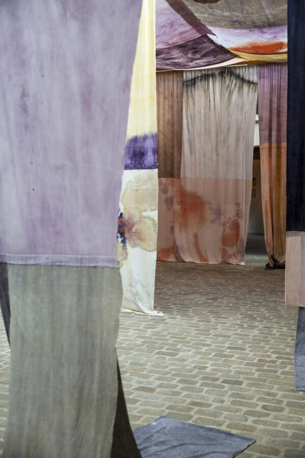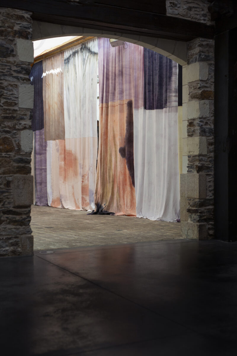 M.F : Les nappes silencieuses est une installation immersive, à la fois textile, vidéographique et sonore, pensée spécifiquement pour le patio de l’Atelier. Tu crées un environnement total que le regardeur-marcheur découvre progressivement, au travers des tissus suspendus, guidé par le son de la vidéo située en arrière-plan. Tu travailles de plus en plus dans des échelles monumentales, qui permettent à tes toiles et installations de surplomber ou d’envelopper le visiteur. Entre déambulations des corps et mouvements textiles, diversité des médiums et approche immersive, conçois-tu tes œuvres comme la proposition d’une expérience à vivre ?