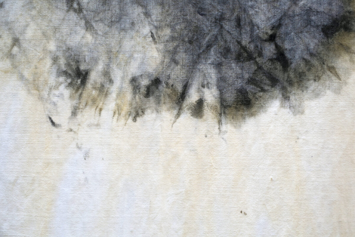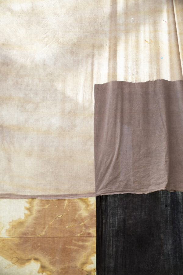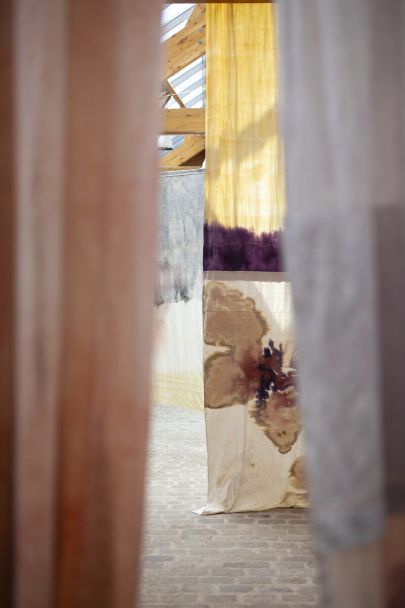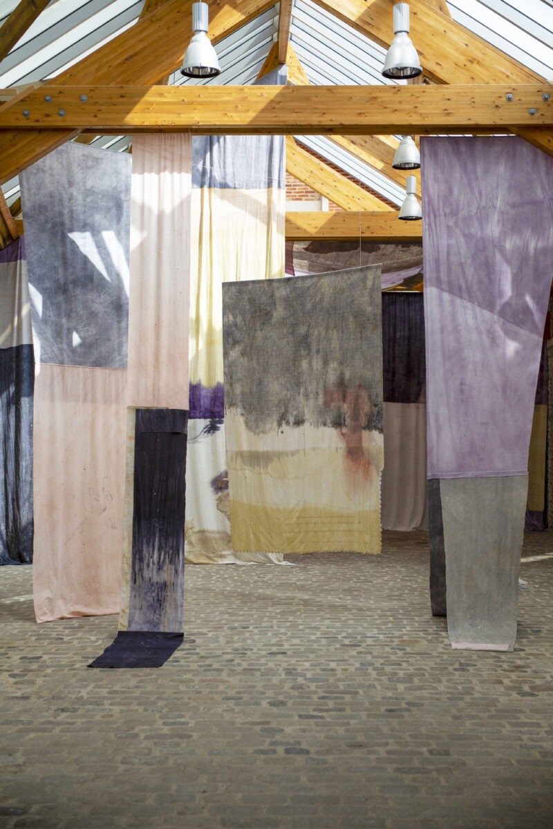 M.F : Les nappes silencieuses est une installation immersive, à la fois textile, vidéographique et sonore, pensée spécifiquement pour le patio de l’Atelier. Tu crées un environnement total que le regardeur-marcheur découvre progressivement, au travers des tissus suspendus, guidé par le son de la vidéo située en arrière-plan. Tu travailles de plus en plus dans des échelles monumentales, qui permettent à tes toiles et installations de surplomber ou d’envelopper le visiteur. Entre déambulations des corps et mouvements textiles, diversité des médiums et approche immersive, conçois-tu tes œuvres comme la proposition d’une expérience à vivre ?