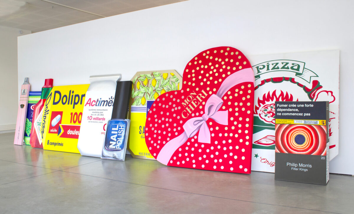 Les peintures de cette série rejouent la question de l’adresse, et ont la spécificité d’avoir un·e destinataire·ice précis·e. Les objets quotidiens de consommation agrandis sur châssis sont envisagés pour leur valeur anthropologique d’attachement et déplacent la question du goût vers les affects individuels liés à l’origine sociale. L’Actimel pour mon frère, la pizza pour ma chienne Cola, le pesto pour Émilie, les Mon Chéri pour mon chéri, le Tabasco pour Salomé, les sardines La Perle pour Élise, le vernis à paillettes pour Chloé, la bolognaise pour ma mère, les Philip Morris puis la vapoteuse pour moi… Elles sont exposées en ensemble modulable, en appui contre le sol et le mur, mimant la remise et le stock de peinture.