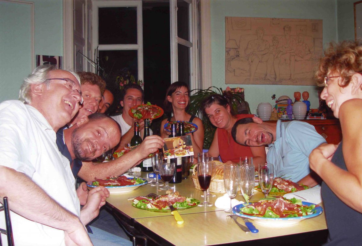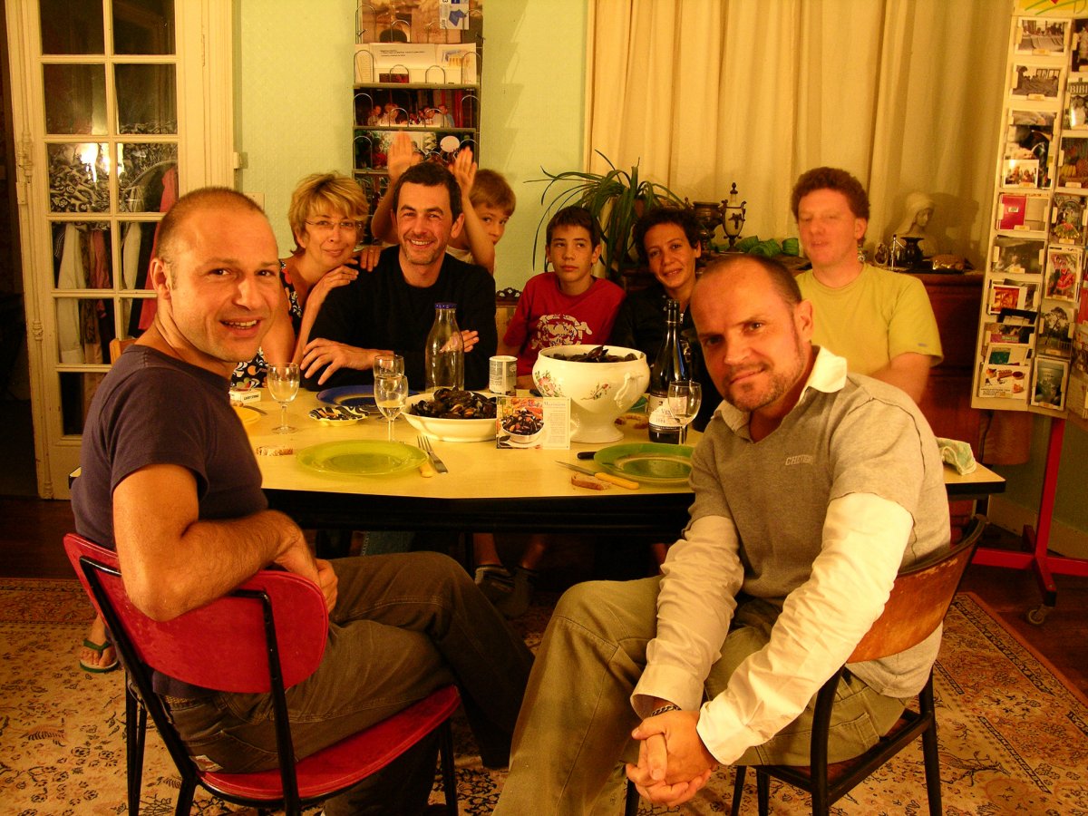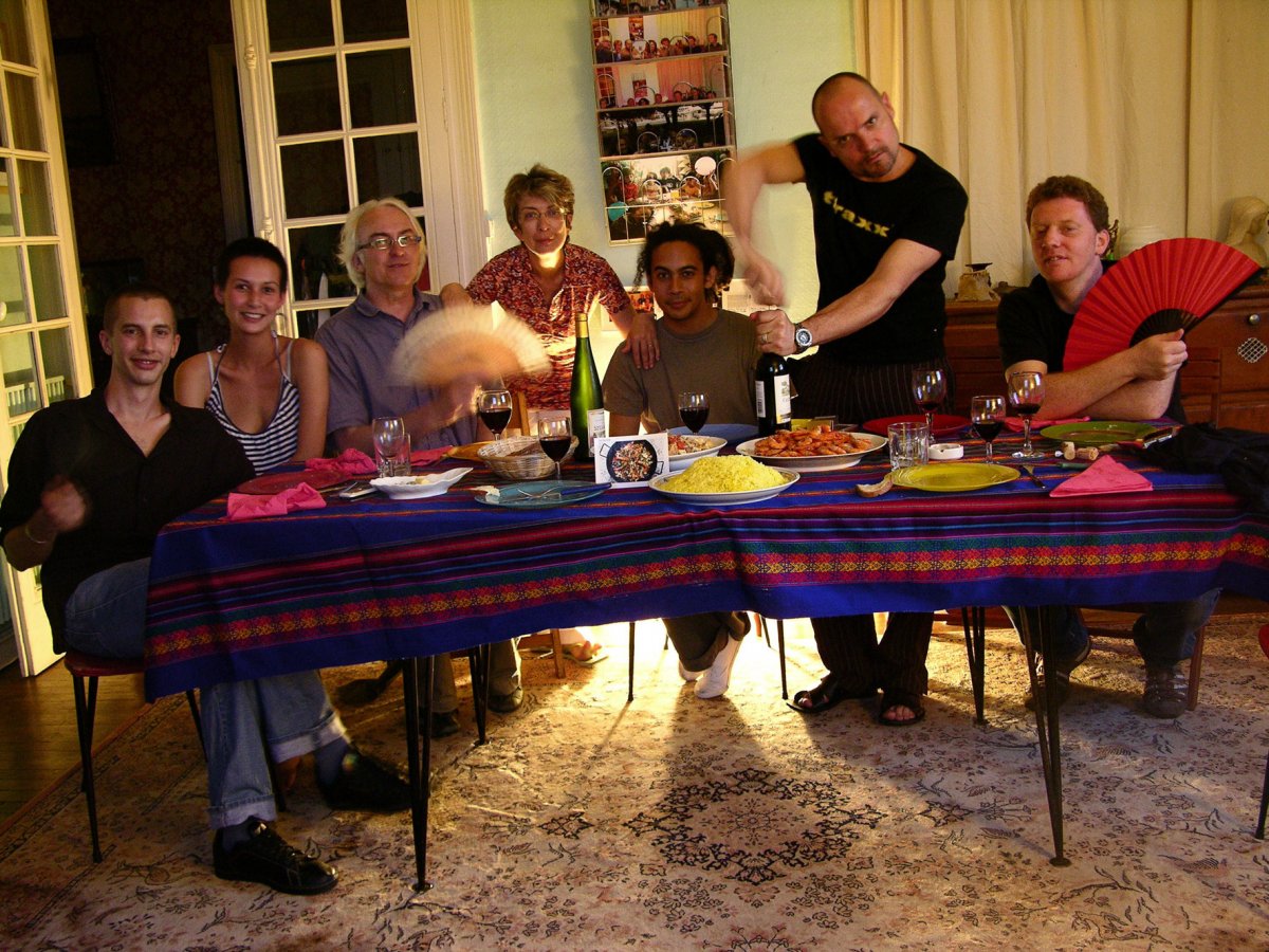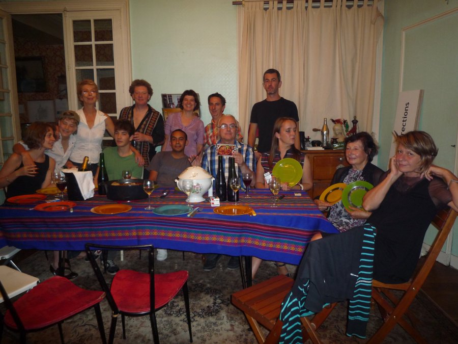 2002 , c’est l’année où apparaissent les premiers repas. Le protocole veut qu’après réception de recettes inscrites sur des cartes postales qui lui sont adressées et dont elle fait collection depuis des années, un repas réunisse un ensemble de convives autour de ce plat. Une photographie de ce moment témoigne de ce rendez-vous culinaire, agrémenté de la présence de la carte prétexte et clin d’œil. Ensuite un set de table est élaboré avec l’image et à son dos le texte et la recette du dit plat. A ce jour le nombre est impressionnant et semble ne jamais devoir se tarir. Un peu comme ce vin de jouvence qui accompagne immanquablement ces généreuses dérives autour de la table.