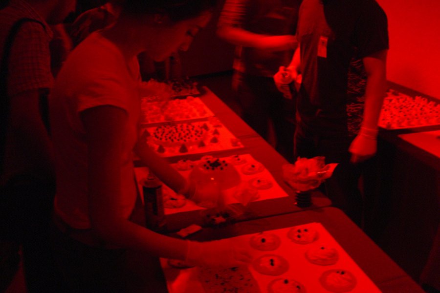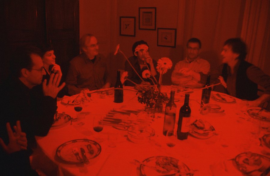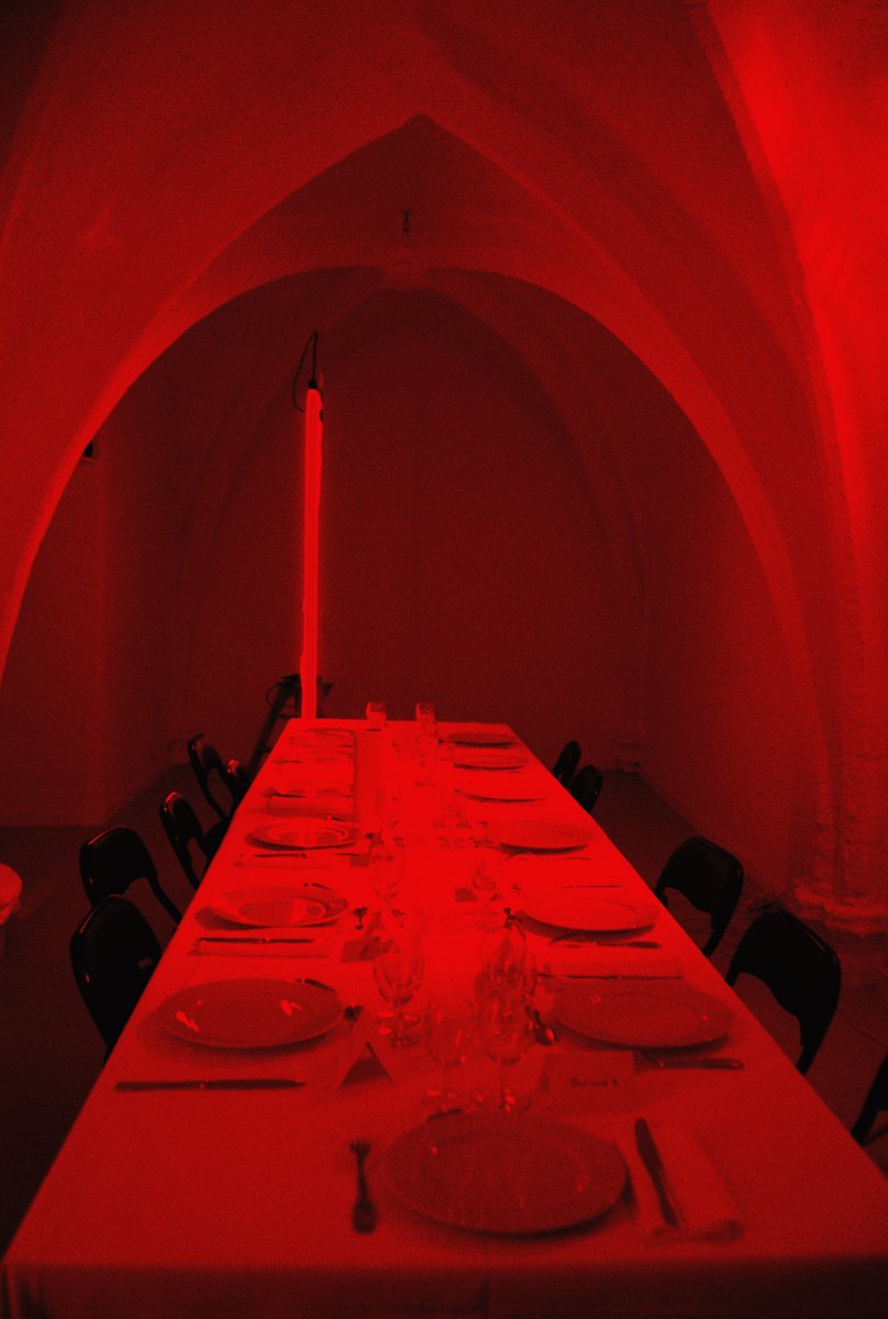 Ces repas ou dégustations sont issus de mes nombreuses expériences d’ateliers en lumière rouge pour concevoir et fabriquer les Perméables. Ils résultent de l’observation des effets surprenants de cette lumière sur notre comportement alimentaire : celle-ci abolit les autres couleurs et nous constatons que si nous ne pouvons pas identifier les couleurs originales d’un aliment et que nous n’en reconnaissons pas non plus la forme visuelle, alors notre sensation du goût est significativement troublée, dérangée. L’absence de reconnaissance préalable par l’œil surprend et déroute le sens gustatif. Déjeuner, dîner en lumière rouge nous révèlent la part déterminante de la vue dans ce rapport sensible. D’autre part, la lumière rouge diffuse une sensation relaxante chez ses visiteurs et instaure une convivialité singulière. Il s’agit à la fois d’une aventure de convivialité particulière et d’une aventure gustative.