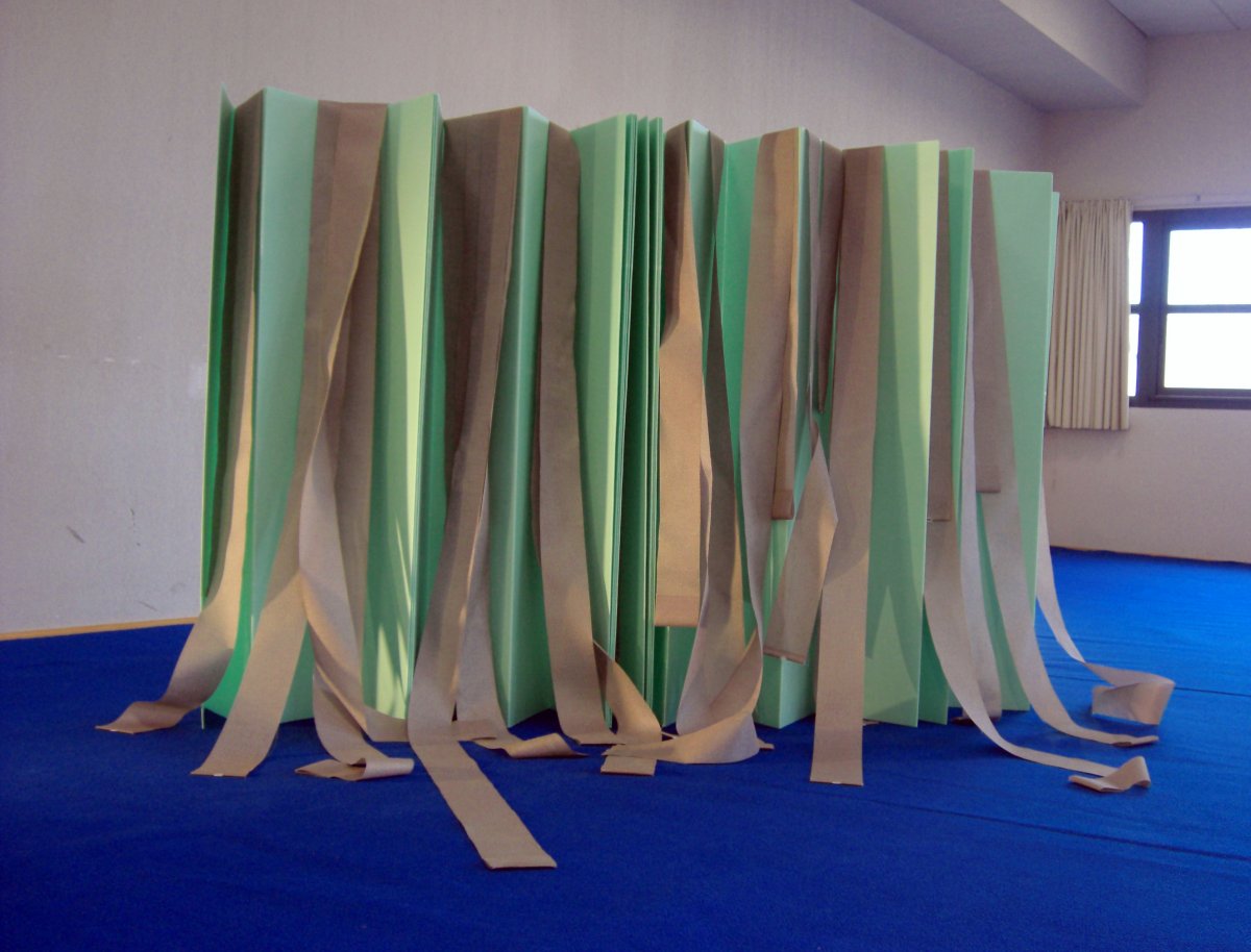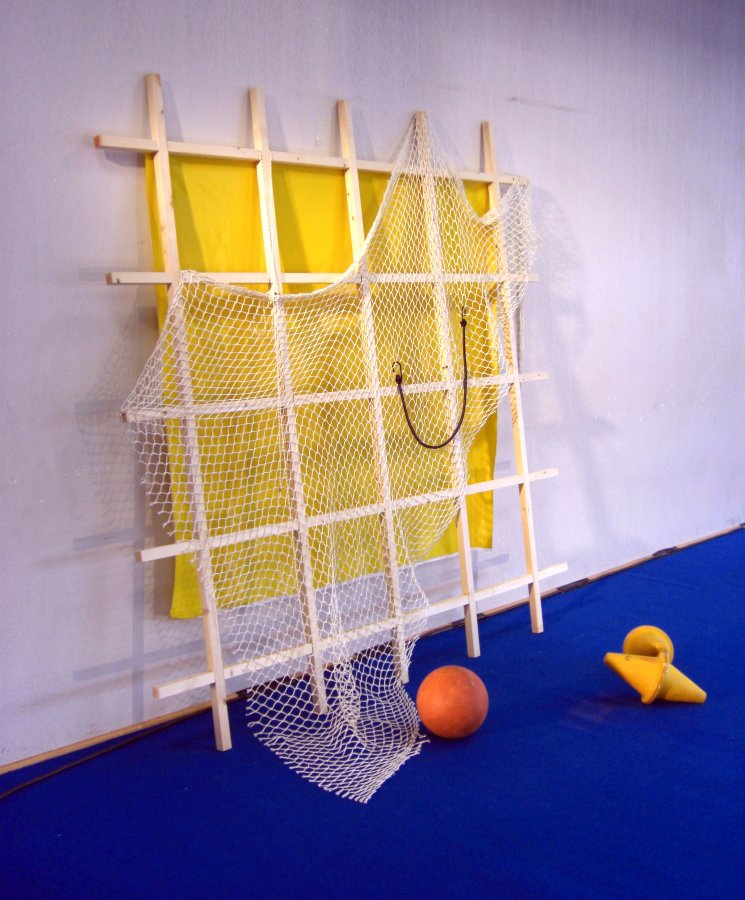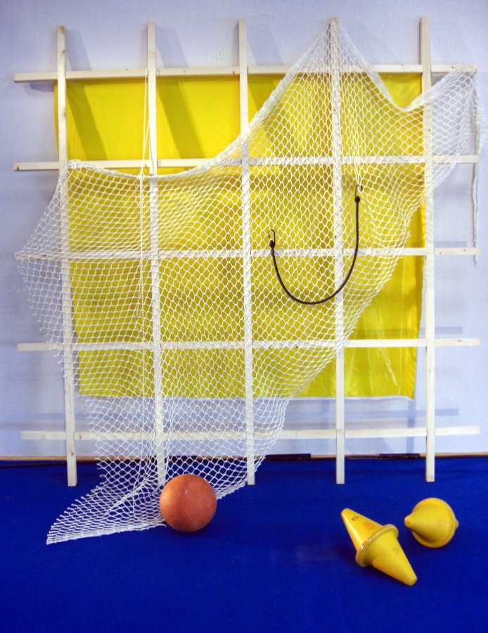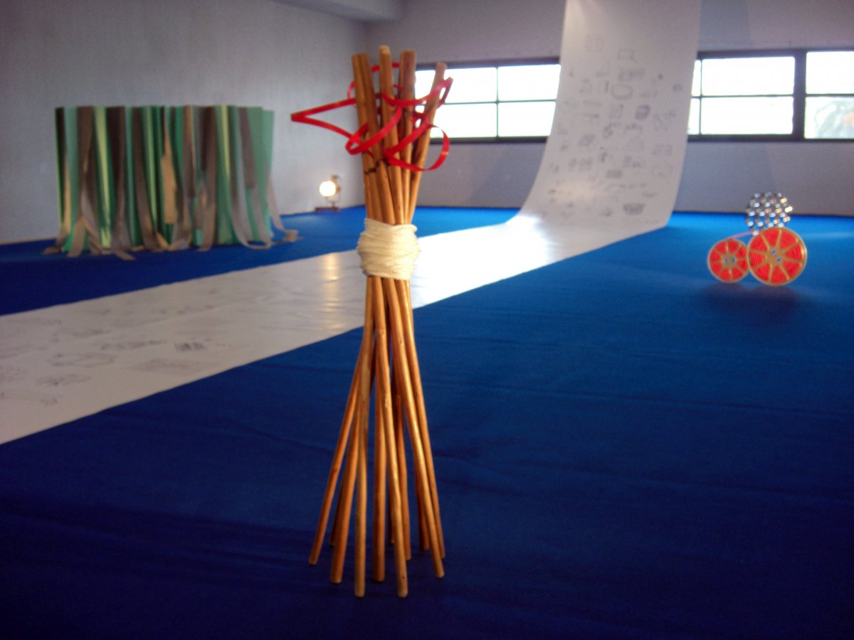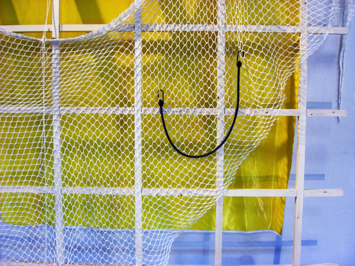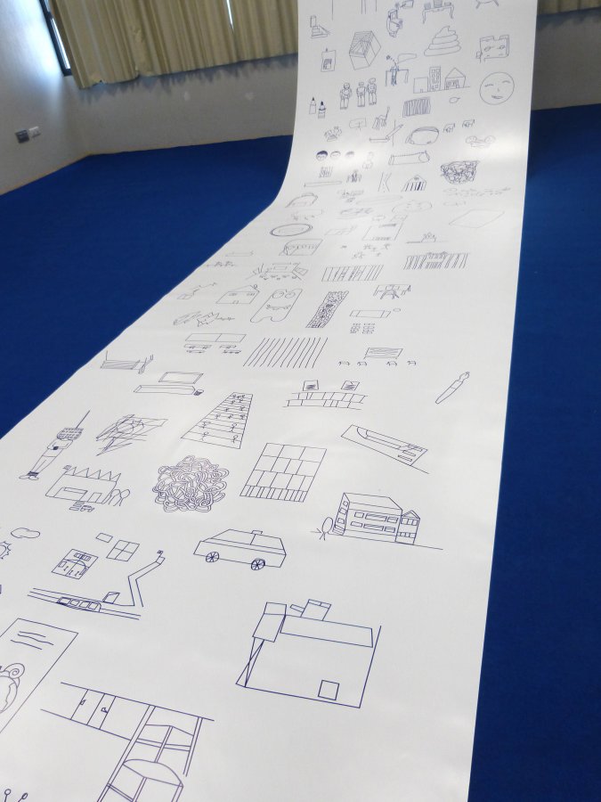 Une bâche imprimée se déploie dans tout l’espace d’exposition. Les dessins des élèves, ont d’abord été photographiés, puis vectorisés et enfin rassemblés sur la bâche. Dénudés des mots et autres informations superflues, ces dessins deviennent des signes dans leurs plus simples appareils. Par la libre association et l’accumulation de ces signes, la déambulation du regard offre un champ de multiples significations. Un jeu s’opère entre la vision globale et la vision détaillée du lé.