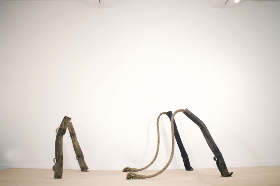 Anne Lebréquer, «Leurs jambes seront toujours fragiles pour leurs combats démesurés», 2024, Cuir, corde chanvre, fer rond acier, fer plat acier
