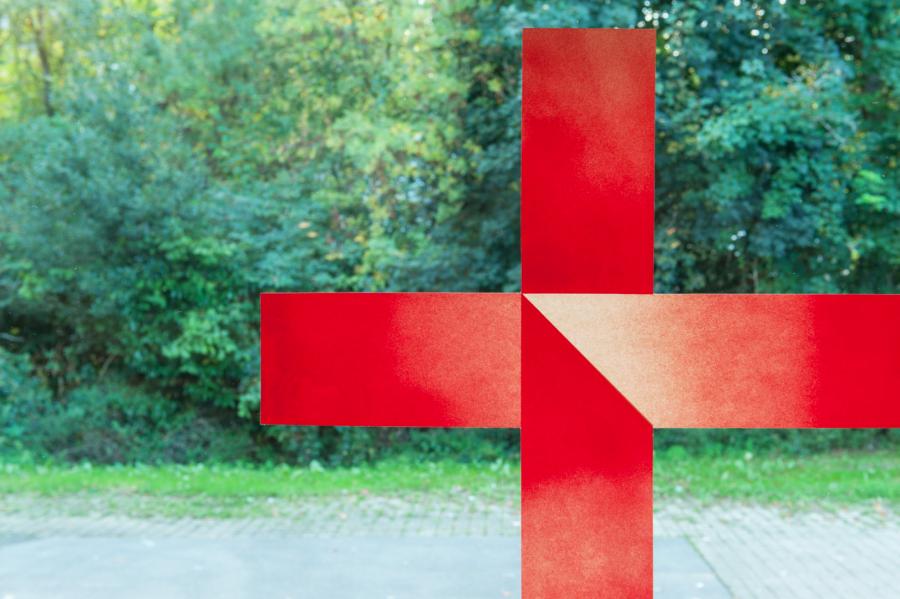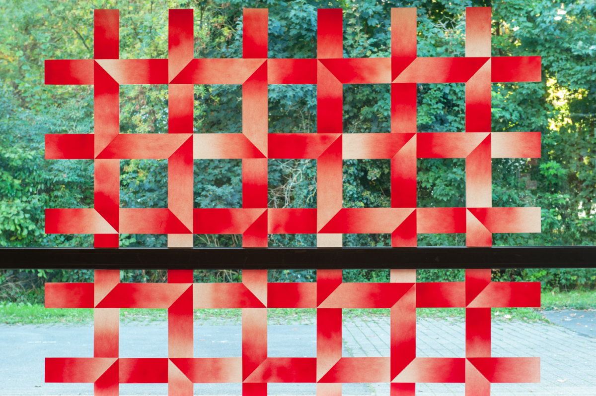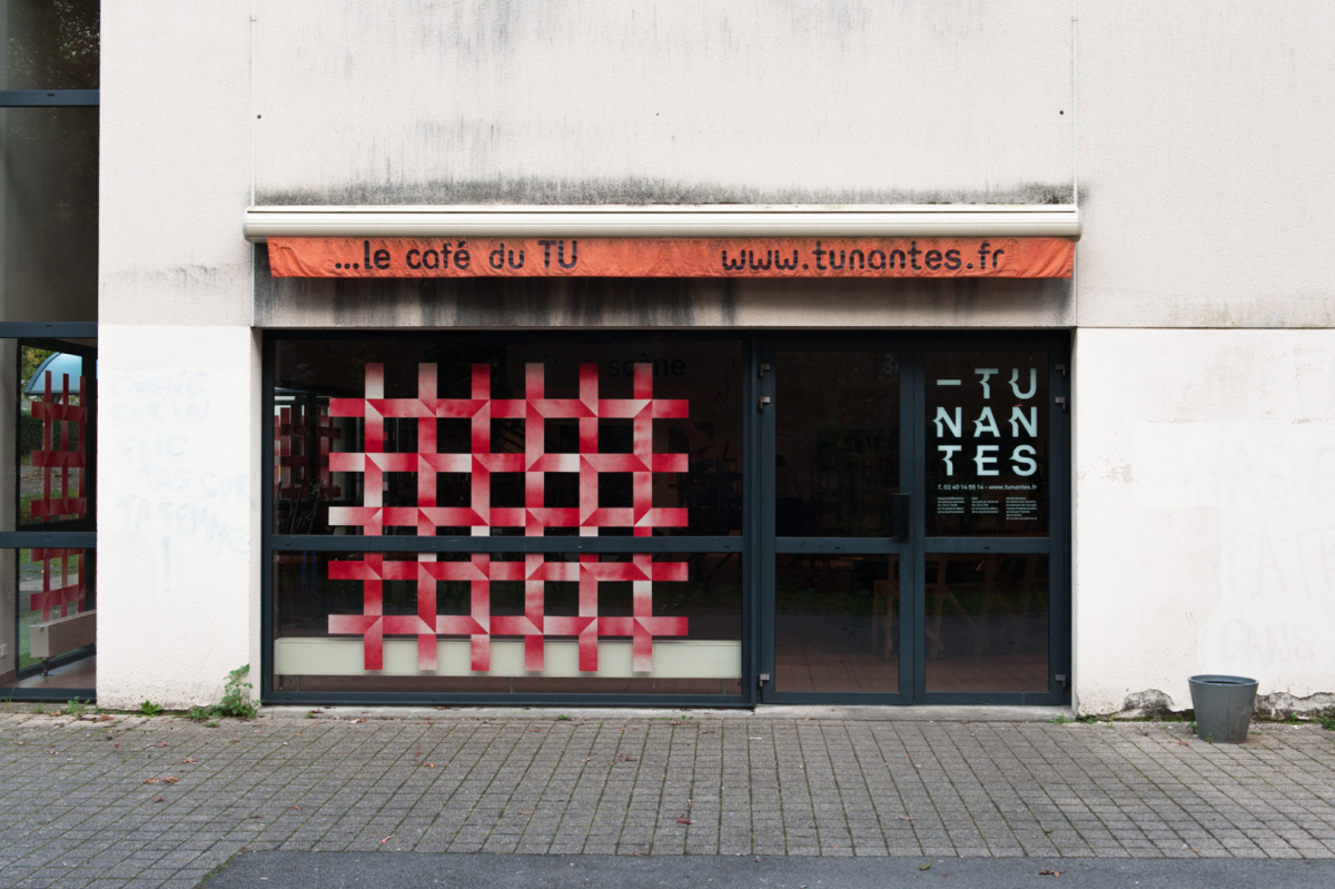 Cette pièce à été réalisé lors d’une résidence d’une semaine dans le cadre du festival BAM pour la rentrée scolaire du Théâtre Universitaire de Nantes en octobre 2017. Lors de cette résidence qui s’offrait comme une carte blanche, j’ai réalisé une pièce sur la façade du rez-de-chaussée du théâtre. Ici il s’agit d’un papier peint modulaire, peint recto verso en dégradé de rouge vers le blanc. Les modules sont collés bord à bord en vitrophanie sur les vitres. Le dessin proposé reprend la forme du quadrillage, le rouge est un hommage aux rideaux du théâtre. Avec cette installation je proposais à l’espace un double jeux: dans un sens il invite la curiosité du passant de la rue à pousser la porte d’entrée, et de l’intérieur il préserve de l’extérieur, il offre une intimité certaine.