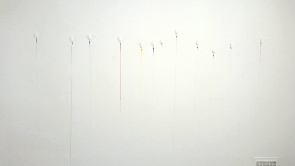 Les spectateurs sont invités à presser la pipette. l’eau coule traçant une ligne de couleur sur le mur.