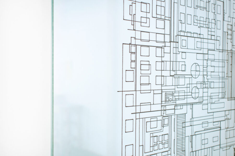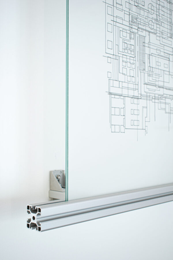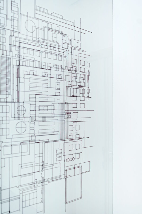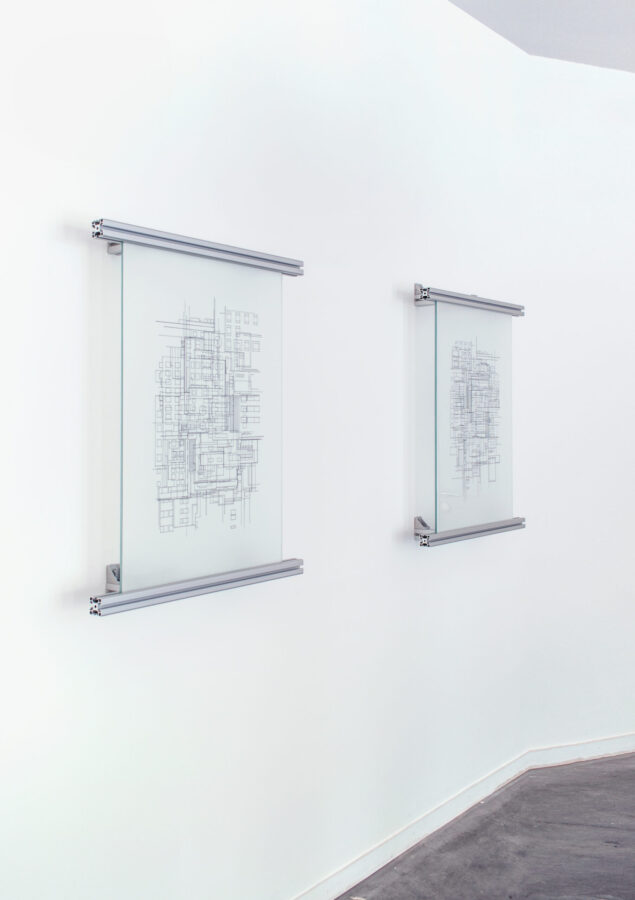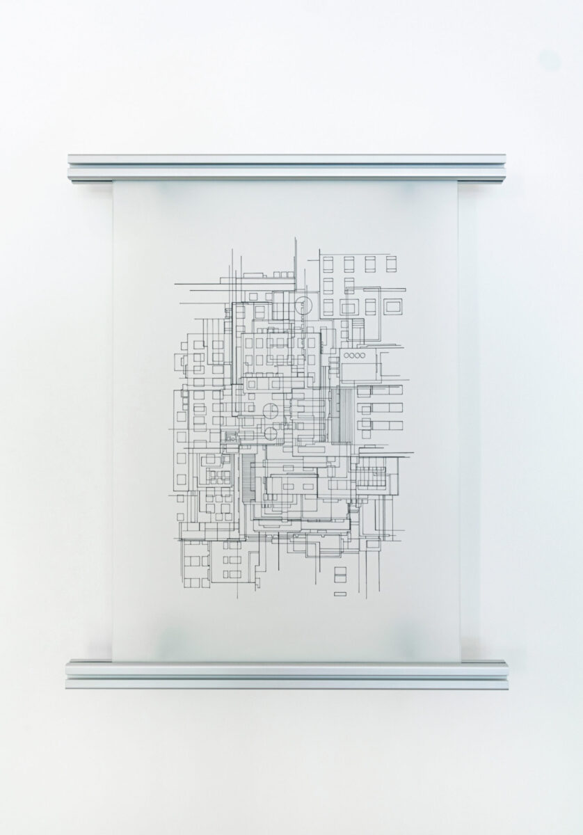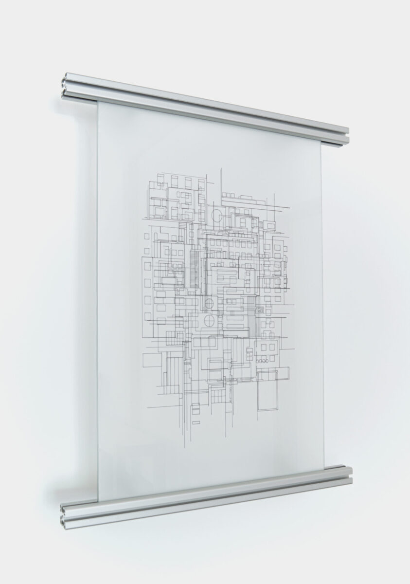 Présentée entre deux verres maintenus par des profilés d’aluminium issus de l’industrie, l’œuvre interroge la porosité entre l’échelle du bâti et celle de la machine.
