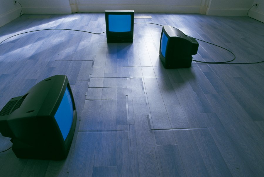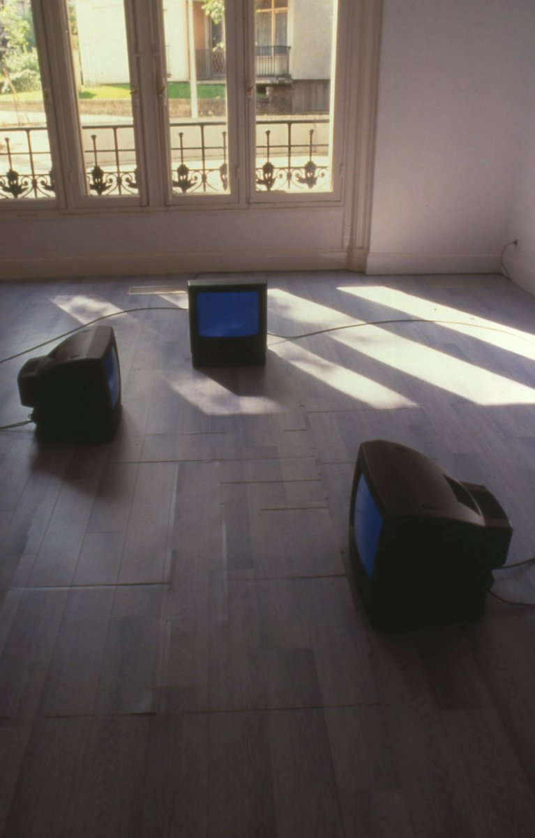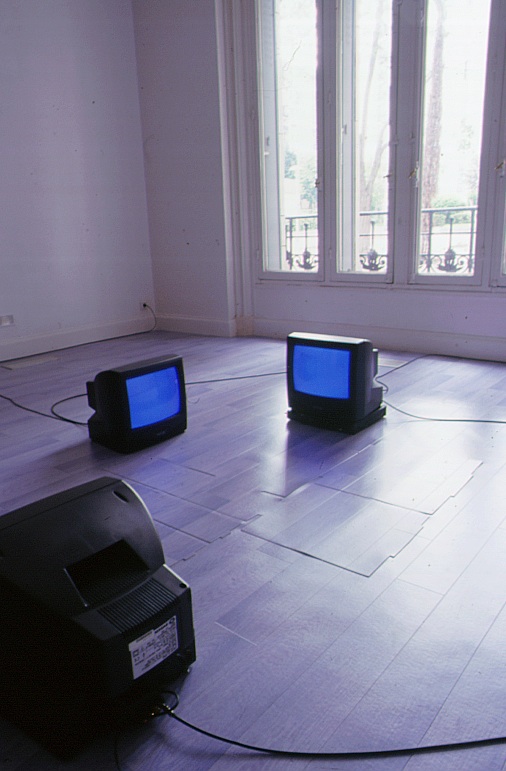 Recouvrement du parquet de l'espace d'exposition par un linoléum bleu, découpe d'un plan de maison standard, trois moniteurs écrans bleus (bleu incrustation)