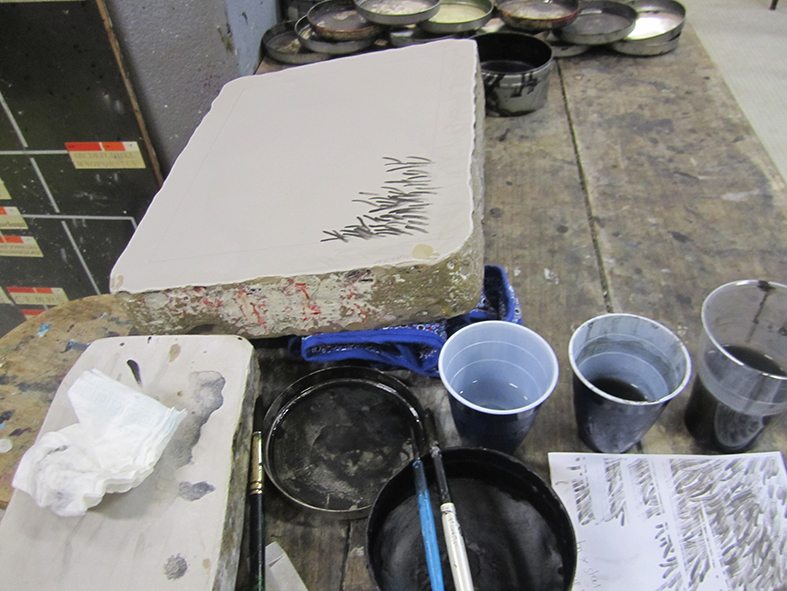 Réalisation de dessins sur pierres lithographiques au sein de l’atelier d’estampe dirigé par Dominique Allard, dans le cadre d’une convention avec l’ESBA Angers TALM.