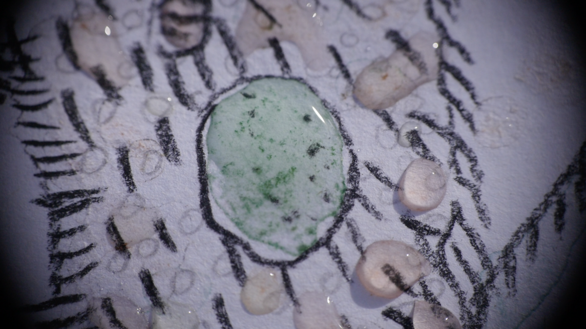 Série de 15 dessins sur papier (21 x 22 cm chacun). Pierre noire et pigments de cyanobactéries provenant de cinq mers, vidéo (loop) d’une macro des dessins en train de se faire (visible au travers d’un judas en porcelaine), 2024