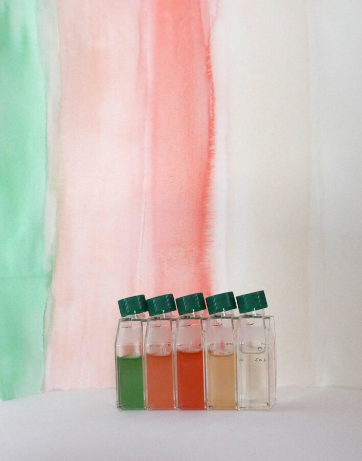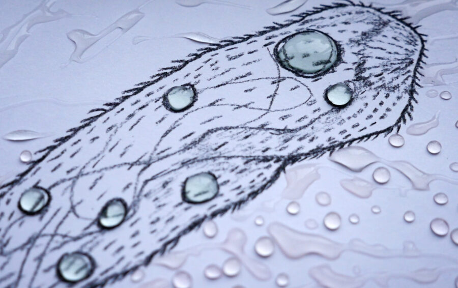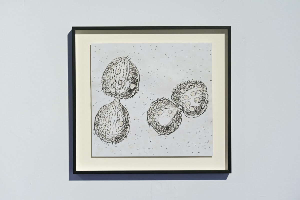 Les cyanobactéries ont été capables de diffracter la lumière du soleil pour générer de l’énergie. Si elles produisent aujourd’hui 20% de l’oxygène terrestre, elles sont surtout à l’origine de l’apparition du vivant en permettant la photosynthèse il y a 2.5 milliards d’années. Grâce à sa résidence à la Station de Biologie Marine de Roscoff, Christine Laquet a pu cultiver par division cellulaire les cinq « couleurs niches » de cyanobactéries présentent dans les mers du globe. Grâce à un système de gouttes déposées sur le papier, ces « pigments vivants » sont venus colorer ses dessins, dont les tonalités vont s’estomper laissant juste apparaitre la trace de la goutte. Little Angry Dragons est le nom familier donné par le Prof. Ehrenberg, qui découvrit ces organismes unicellulaires ancestraux, ceux qui défient encore aujourd’hui notre perception des systèmes de classification standard car elles n’appartiennent pas au genres (ni animal, ni végétal, ni mâle ou femelle).