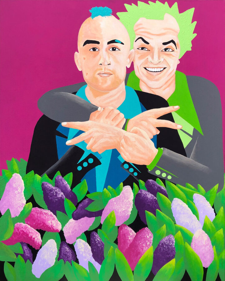 Etalonnés colorimétriquement pop, voire fluo, et même psychédélique, ces groupes posent devant des massifs de fleurs, poncifs de la photo de mariage.