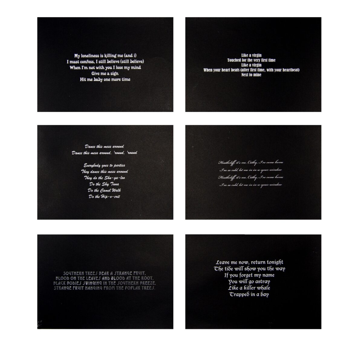 lyrics est une sérigraphie qui regroupe les paroles de chansons populaires. Chaque texte a sa propre voix, matérialisée par une police de caractère qui lui est assignée, dans le but de différencier les multiples nuances de voix propre à chacune des chanteuses qui ne se feront jamais entendre. Ce travail est un appel à la mémoire individuelle et collective des regardeurs, afin de faire résonner cette voix intérieure par des chants communs.