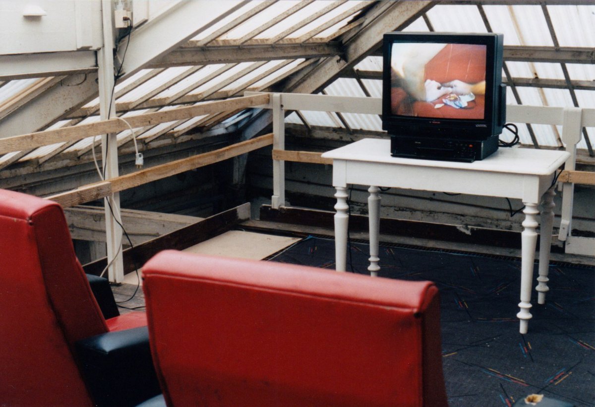 Deux fauteuils, une table avec un tiroir, photographie, film vidéo, un ensemble de petit objets exposition De ci de là du cinéma, huis et au delà, Asso MIRE, Atelier Alain Lebras, Nantes