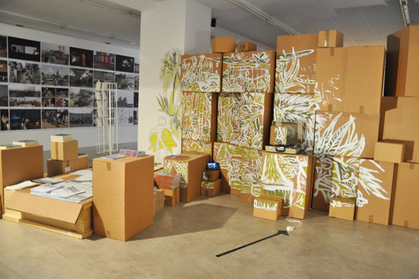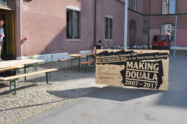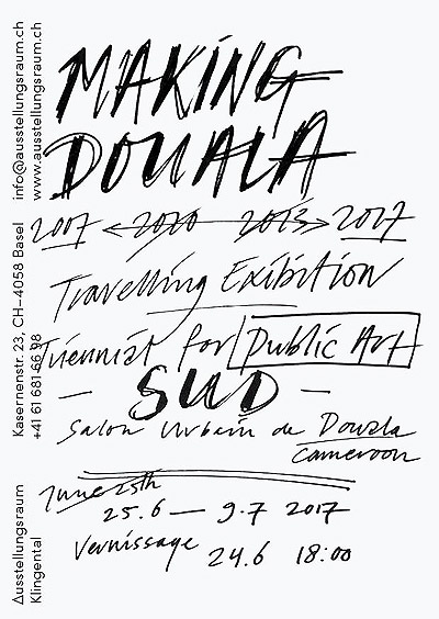 MAKING DOUALA 2007-2017 explores the relationship between artistic production and urban transformation in Africa. It does so through the remarkable experience of SUD – Salon Urbain de Douala, an international triennial festival dedicated to public art that was inaugurated in 2007 in Douala, Cameroon, and that has brought a conspicuous number of Cameroonian and international artists to engage with communities of various neighborhoods and the public spaces these relate to in the city. All artworks are realized with local resources, thereby supporting local economies and integrating the projects in the local context. Beside their artistic aims and cultural relevance, these interventions have a strong social and political dimension, fostering the value of the public space and the sense of ownership by the interested communities, something that is not commonly found in African cities. Their impact on citizen’s views and perceptions of the city is significant, as shown by research assessing how culture affects safety and security in African cities, including Douala. The Basel exhibition is also an opportunity to share insights gained through these scientific investigations. The travelling exhibition MAKING DOUALA is a travelling exhibition meant to share with a wider audience the SUD festival achievements and the impact its public art projects have had in terms of urban transformation in Douala. It does so through posters, models, prints, drawings, video and films, documentaries, publications and multimedia installations – each project on its own terms and the overall exhibition in a way that takes into account and adapts to the artistic context of the hosting venue, including with site-specific initiatives. The exhibition in Basel builds on previous editions, that were presented at the 5th International Architecture Biennale Rotterdam, at Dak’art Dakar and Entrepot Fictief Gent in 2012, and Gallery Paradise/Le Voyage à Nantes in 2013.