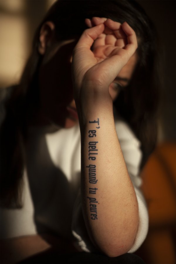Ces mots tatoués sur des modèles qui sont l’entourage direct d’Ariane sont des mots d’amour ou de soutien échangés entre amis, amoureux et familles. La forme d’un tatouage nous rappelle que quand l’homme a besoin de repère, le tatouage peut en devenir un.