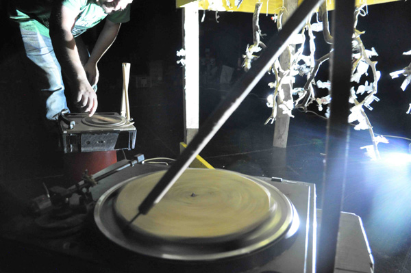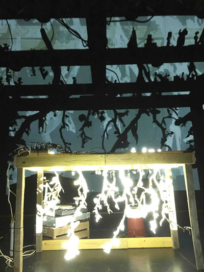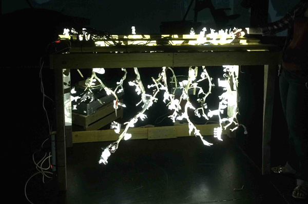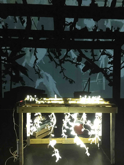 Projet d’un jour: les enfants arrivent et me dessinent leurs loups et leurs mémés, après deux heures de découpage, de mise en place sur les branches tournantes au rythme des moteurs de boules à facettes, et de mise en Lumière et sons, les enfants découvrent l’installation…La machinerie de branches est filmée et projetée en directe, les images blanches sont produites par la projection des images filmées, les images noires sont les ombres de la machinerie occultant la projection vidéo…Les moteurs tournants à des vitesses differentes, l’image projetée est toujours nouvelle et dans un mouvement lent, tel le mobile au dessus du lit de bébé… Ou peut-être le mobile au dessus du lit de Mémé…