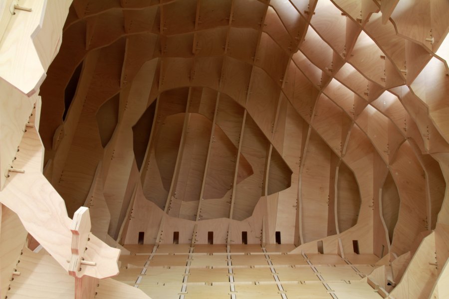 Le projet développé par Vincent Mauger pour le MicroLab, est l’une des deux œuvres in situ commandées à des artistes et des architectes lors de l’ouverture des Turbulences – Frac Centre en 2013. Oscillant entre monde physique et monde virtuel, la sculpture prolonge le relief de la trame déformée de la cours des Turbulences derrière les murs du MicroLab. Pensé pour l’espace pédagogique, ce « cocon » se présente comme un espace enveloppant à destination des enfants, qui engage une véritable expérience physique. Praticable, l’œuvre invite à différents usages et expérimentations (parcours d’éveil, ateliers, etc.). L’artiste puise en effet dans les outils numériques de nouvelles logiques de conception des objets. Ceux-ci, réalisés le plus souvent avec des matériaux ordinaires (brique, métal, polystyrène, tuyaux de PVC, bois, papier), associent techniques de construction artisanales et calcul numérique. Les volumes qui en résultent font résonner dans l’espace leurs surfaces complexes et composent des paysages aux topographies chahutées.
