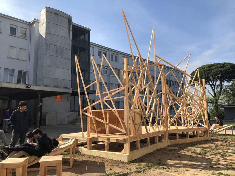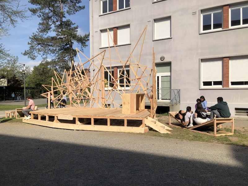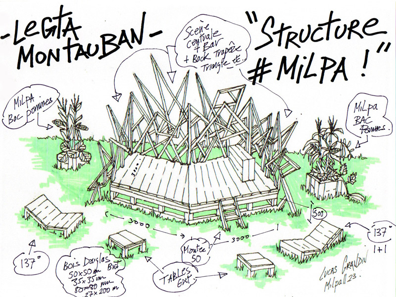 Le projet Milpa construit au Lycée agricole de Montauban, répond lui aussi à cette idée de partage, d’échange et de communion. Agora au cœur du lycée, Milpa offre aux élèves du lycée un nouveau lieu ou ils peuvent se retrouver et se reposer dans de grands transats. Equipée d’un bar et d’un grande scène, ce lieu répond aussi à une volonté d’étendre le foyer en extérieur et propose un espace scénique pour des concerts ou représentations de tous types, pour une plus grande ouverture à la culture au sein de l’établissement scolaire.