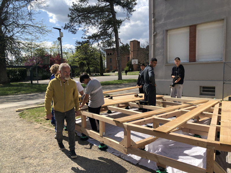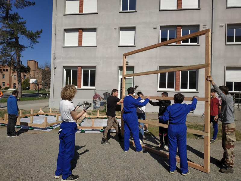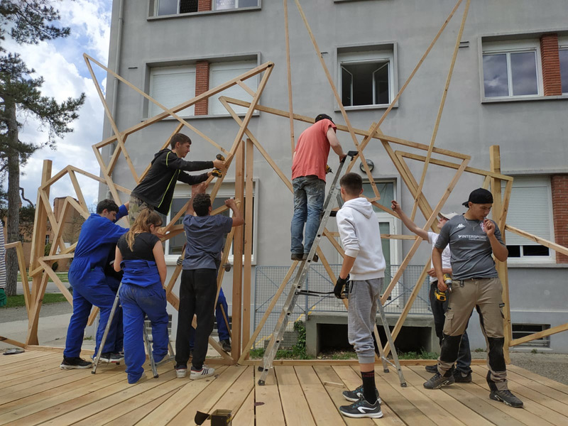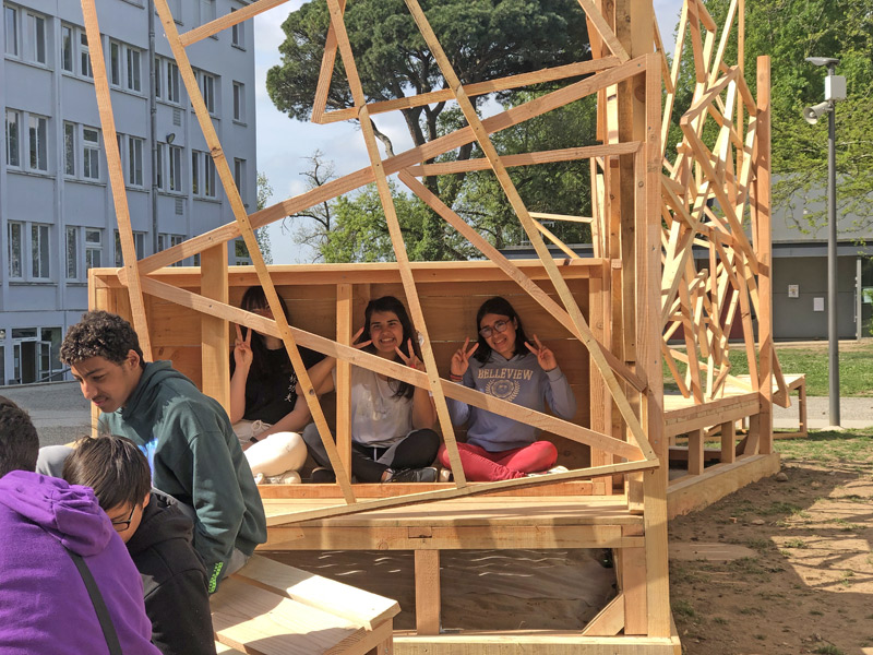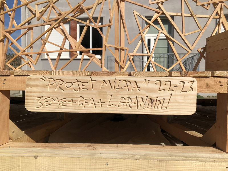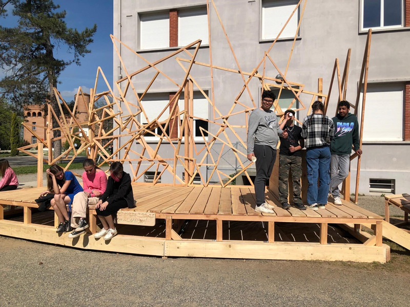 Mais ce sont aussi des adolescents avec leurs énergies et leurs questionnements. Habiter au sein d’un lycée, donc d’une communauté n’est pas toujours simple, accepter le regard, la parole des autres n’est pas une évidence tous les jours, surtout pour un ado ou un jeune adulte. La structure Milpa a donc proposé aux élèves de penser et construire ensemble un espace où ils peuvent se retrouver, se reposer, un espace à eux dans l’enceinte du lycée. Un espace aussi qui ressemblera à leur futur territoire, mi-architecture, mi-jardin avec des plantes du biotope local, du mobilier pensé avec eux participant à cette nouvelle zone à habiter. Un espace conçu par leurs individualités pour créer un habitat cristallisant leurs liens sociaux.