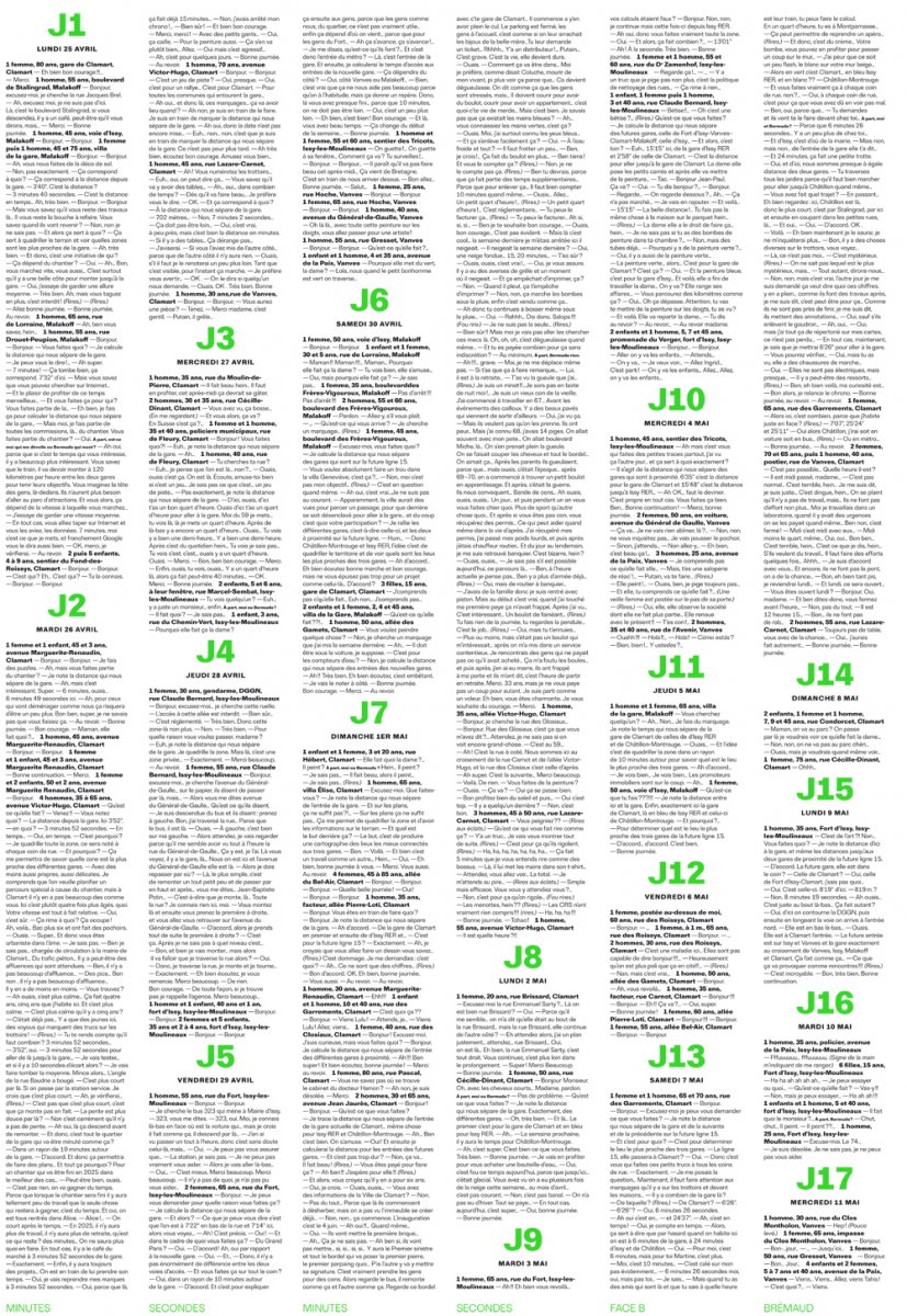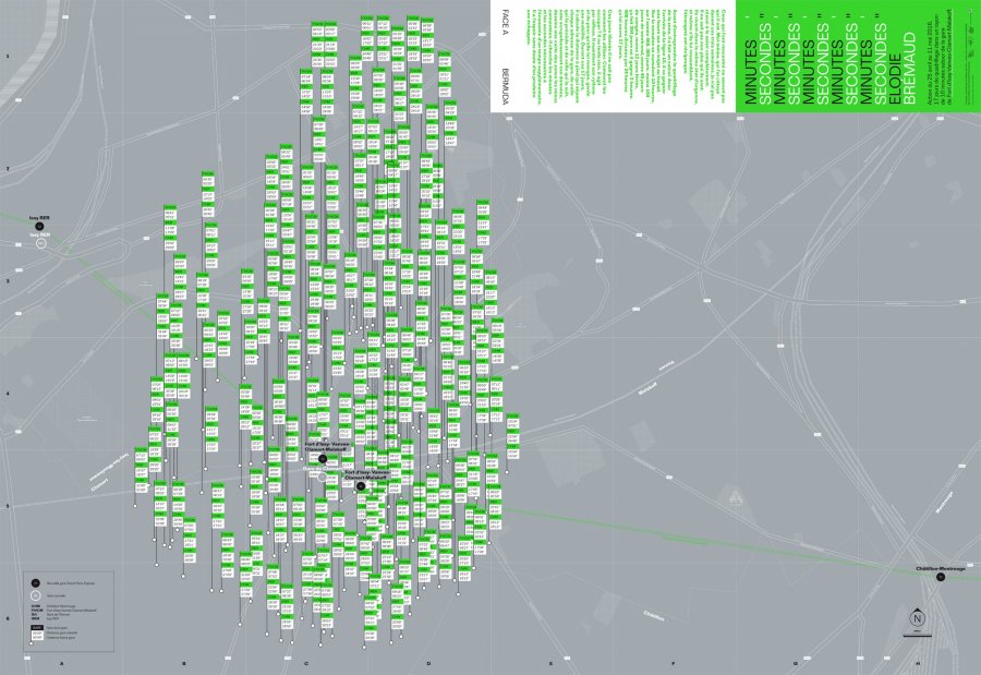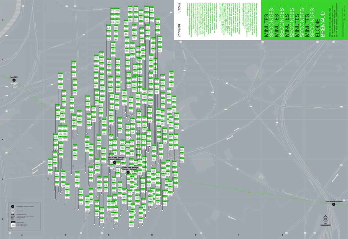 Pour ce projet, Elodie Brémaud élabore une action dans un rayon de 10 minutes autour de la gare Fort d’Issy Vanves Clamart. Pendant presque 3 semaines, l’artiste incarne un personnage nommé BERMUDA. Avant d’entreprendre le quadrillage de la zone, celui-ci a fait un calcul. Avec l’arrivée de la ligne 15, il va gagner une heure sur son trajet au travail, sur la semaine se cumule 10 heures, sur l’année 408 : 17 jours. Ces jours libérés comment les occuper ? Par réflexe, il arpente l’espace public en direction de la gare et des 2 gares de proximité, Issy RER et Châtillon-Montrouge et calcule la distance à pied qui sépare chaque coin de rue des entrées actuelles et futures des différentes gares, note scrupuleusement ces données, dessine une carte des zones les mieux connectés. Il cherche les minutes et les secondes nécessaires à l’économie d’un temps supplémentaire. Il a l’espoir sans doute d’en produire une échappée.