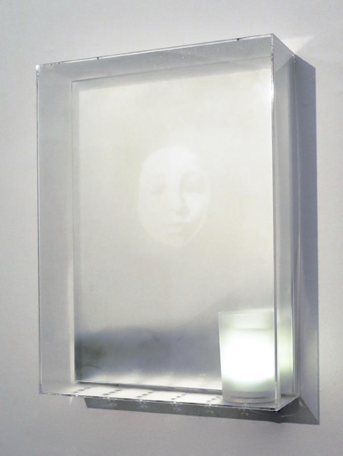 Dans ce miroir embué, on cherche en vain une forme d’expressivité. On y découvre à la place un visage nu, yeux clos, l’accès à une intériorité est empêché en l’absence du regard de l’artiste.