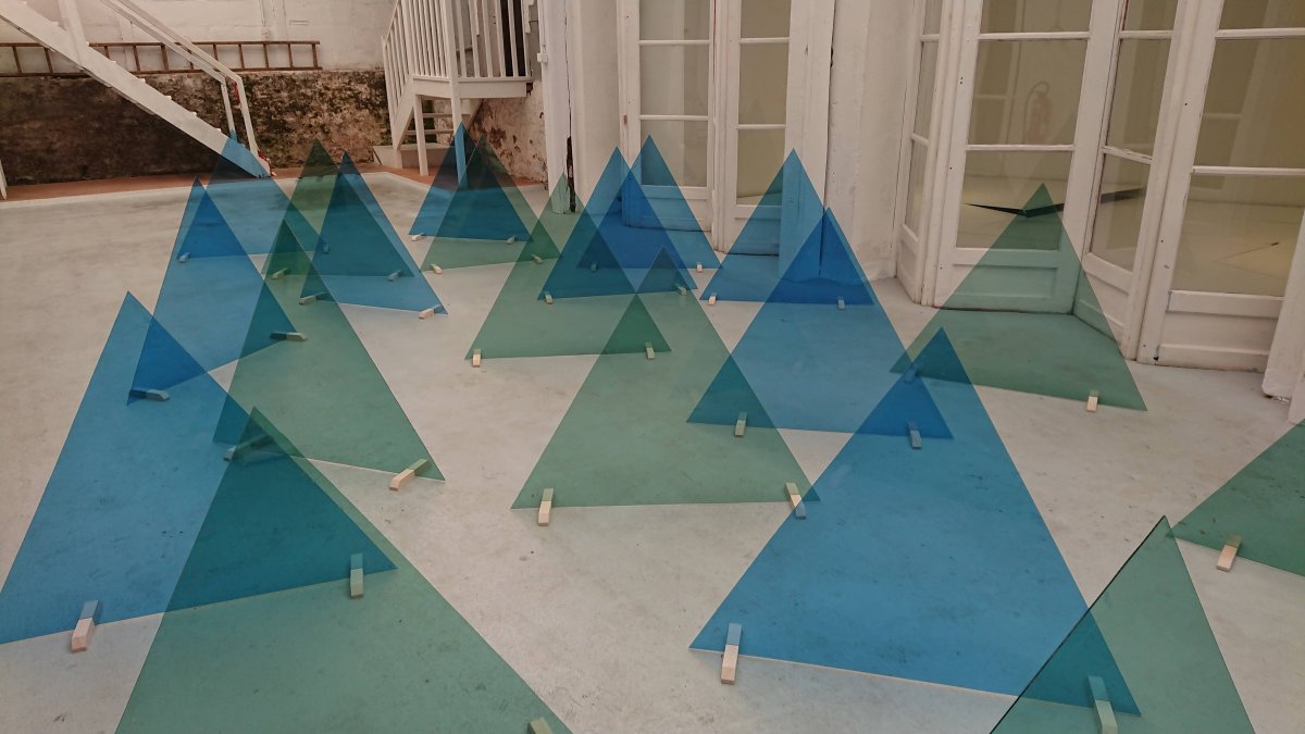 Des triangles en plexiglas se superposent au regard formant ainsi une installation invasive et créant un paysage.