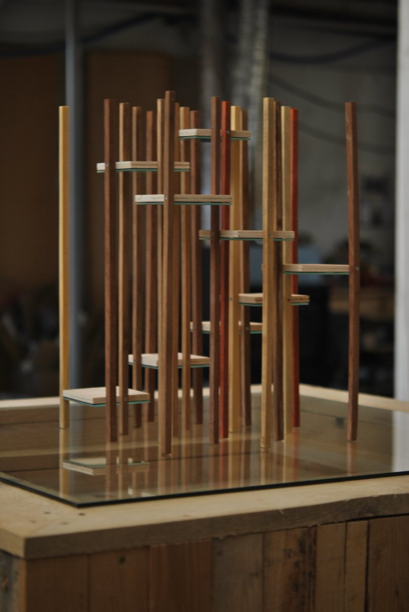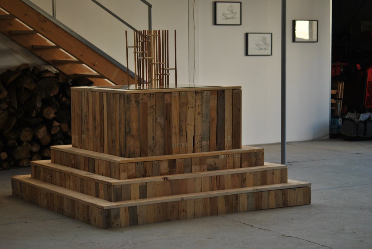 Located in the center of a patio, Monument is a sculpture between furniture and architecture. While it is presented as a massive pedestal on which a light construction of helical inspiration is simply posed, the sculpture reveals itself as you approach it. Monument actually merges three distinct spaces: that of a block whose dimensions correspond to those of the encompassing architecture, that of a hollow forum on the scale of the model sealed under a window, that of the miniature of architecture immersed in the infinity of its reflection. By superimposing different scales, the interior and exterior are disturbed and disturb our perception and our relation to the dimensions of the sculpture. Kinetic, Monument invites you to project yourself into a universe reminiscent of science fiction (Cf. scene of the giant tesseract from the film Interstellar or that of the entry of astronaut Bowman in 2001, the space odyssey in the colored tunnel near Jupiter).
