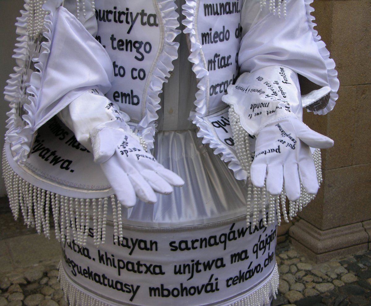 Comme un projection d’écritures, confidences brodées de différentes langues : quechua, aymara, guarani, espagnol et français. Langues de mes rencontres durant mes séjours en Bolivie.