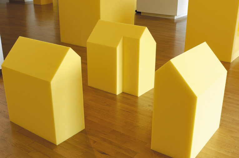 Musée d'Art et d'Histoire Cholet Blocs de mousse de polyurétane semi-rigide jaune, 5 vidéos sur support mural (images : travellings de zones d’activté commerciale, bande son :phrases comportant un adverbe de lieu prisent dans des téléfilms)