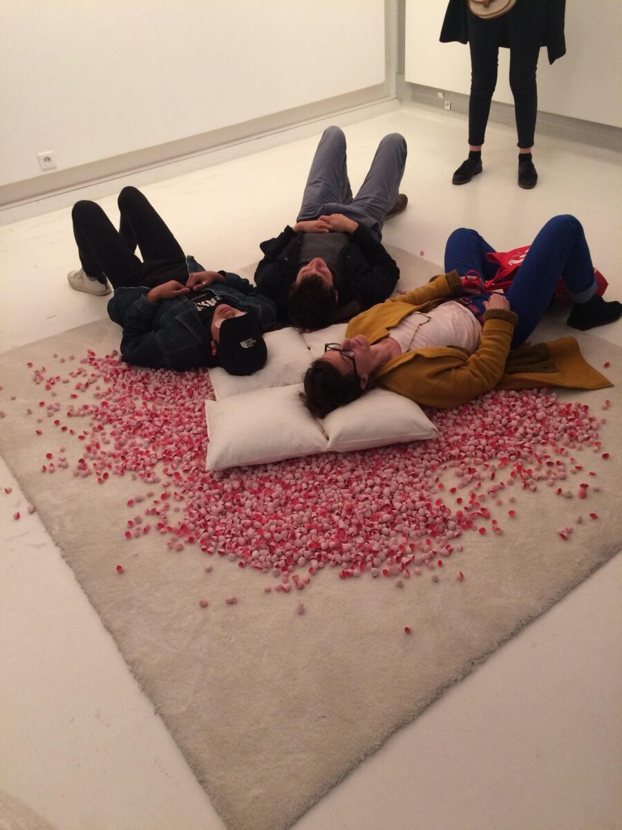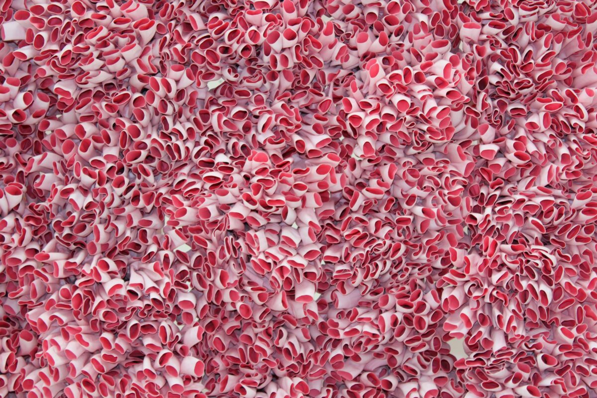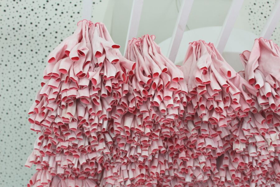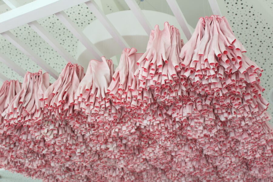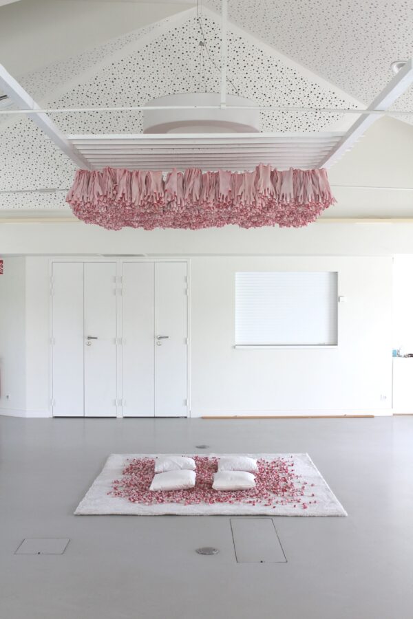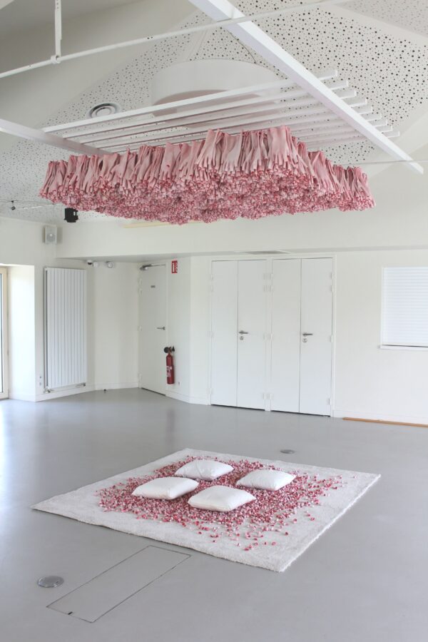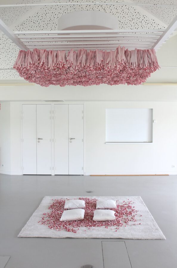 Gants de ménage en latex rose, tasseaux en bois, peinture, fils de nylon, carré de moquette, coussins, 200 cm x 200 cm, co-production Maison des Arts de Saint-Herblain vues de l’exposition "Nov’Art" , l’Engrenage-moulin de Villevêque, 2022, et de l’exposition Dans le corps d’un être vivant, Maison des Arts de Saint-Herblain, 2019 © Adagp, Paris, 2024 sur une invitation de la commune de Villevêque