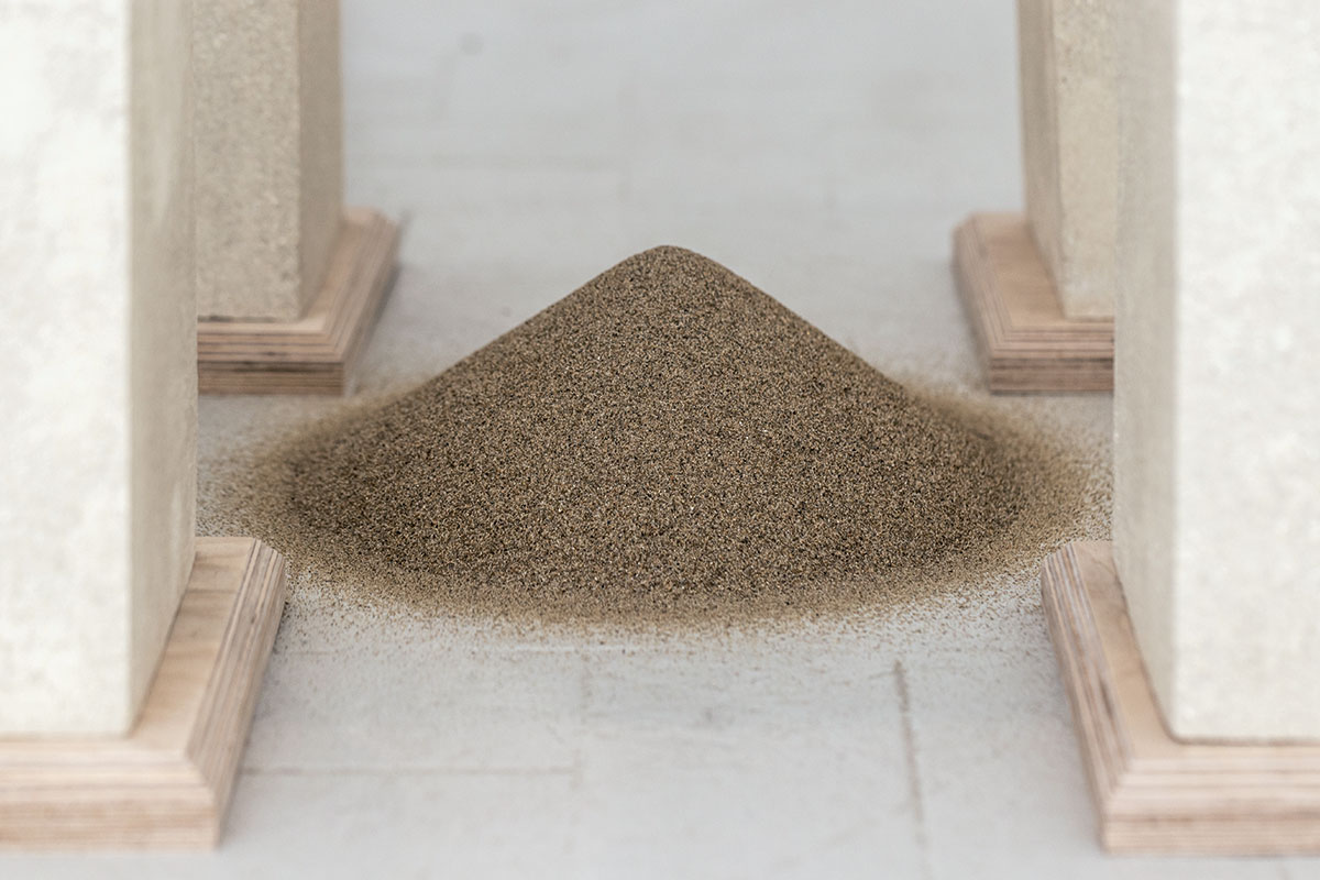 H.D : Ces pièces fonctionnent en effet sur un système de complémentarité. La base est mate et rugueuse, l’élément en verre posé par-dessus est lisse, brillant et transparent. Cinq des onze pièces n’ont pas de module en verre. C’est dans le contraste que les éléments se révèlent. Le sable installé en tas, en écho à ces formes construites, me permet de raconter une autre version de cette ville. Est-elle en construction ou en train de disparaître ? Ces thèmes sont en écho avec des récits de science-fiction. Avec ces couleurs crépusculaires (qui évoquent une possible fin du monde), à l’aide de ces textures comme celle du sable par exemple, j’évoque un environnement sans eau, aride… une terre sans homme.