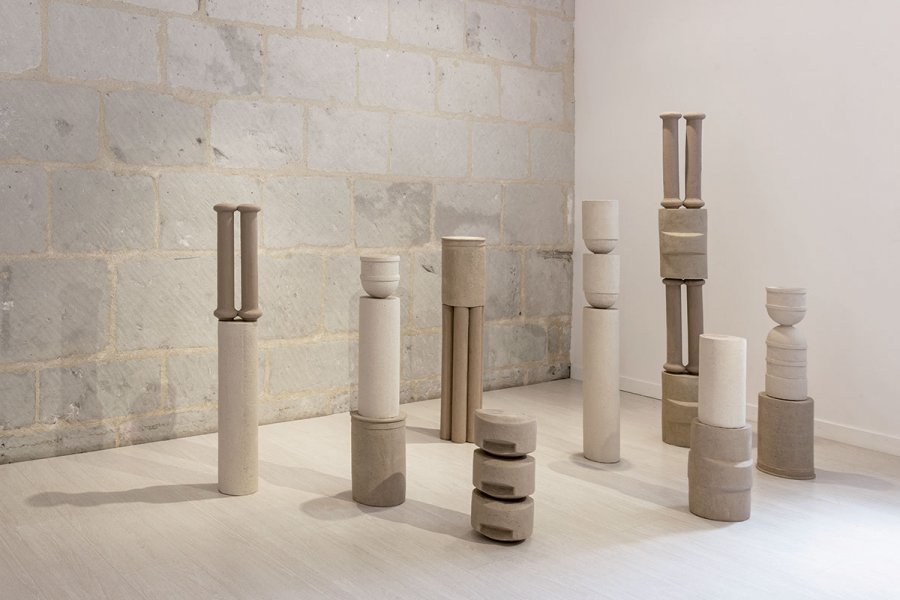 Moulage, modelage à la plaque, grès chamotté sable, bouleau, chêne, sable, letage – Dimensions : h. 115 x L. 110 x l. 65 cm et h. 125 x L. 65 x l. 65 cm – Réalisé avec le soutien du Frac des Pays de la Loire, en collaboration avec MilleFeuilles