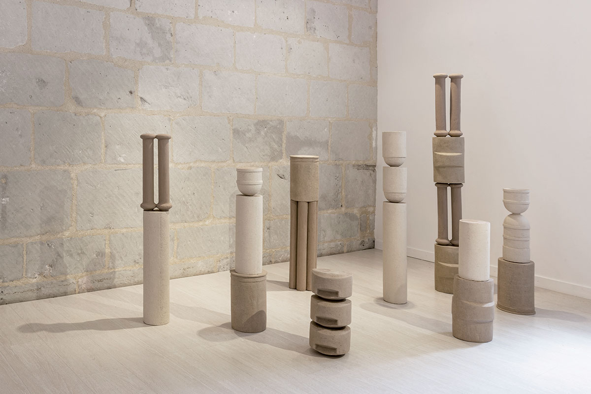 H.D : Les colonnes ont été produites dans des moules en plâtre et en filasse. Le principe du moulage permet d’opérer un travail sériel de formes génériques, des multiples. Pour les autres éléments j’utilise la technique de la plaque. Ce qui m’intéresse dans cette approche, c’est de pouvoir travailler la question du volume en produisant des éléments en deux dimensions, pour créer un objet en trois dimensions. La façon de travailler le matériau du plan au volume, un peu à la manière d’une couturière qui utilise des « patrons », est une technique qui devient prédominante ces dernières années dans mon travail.