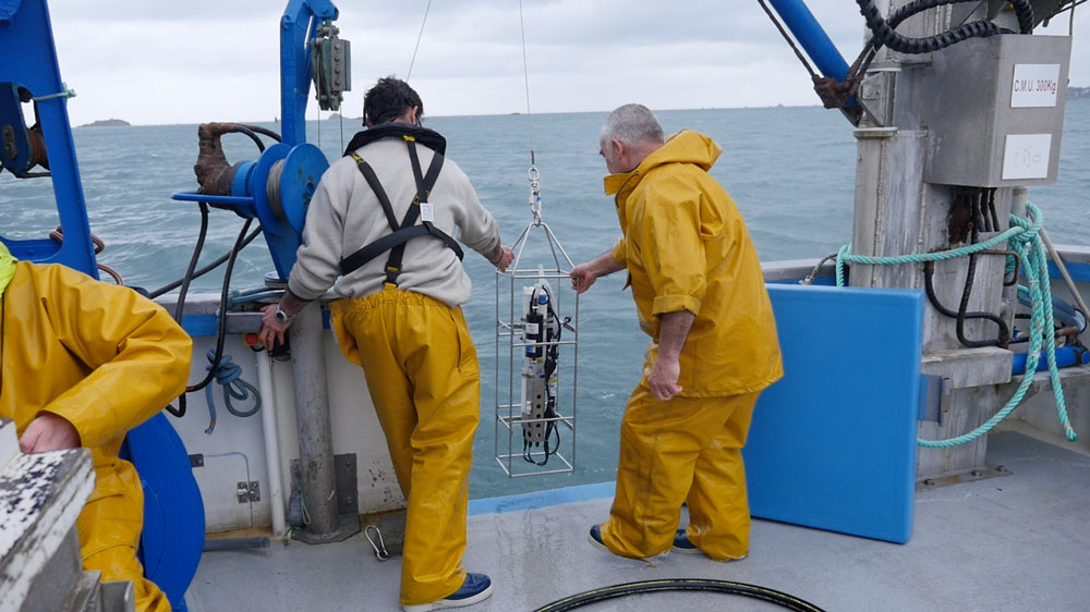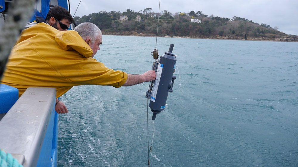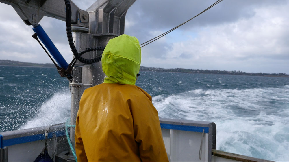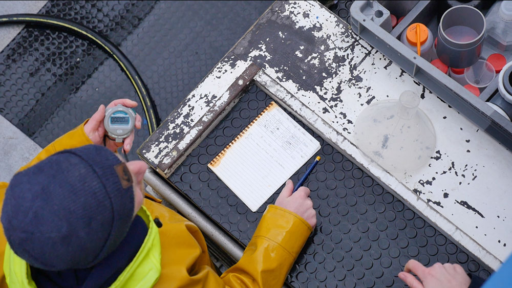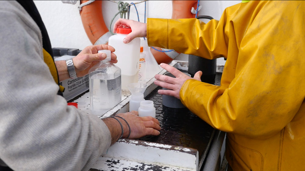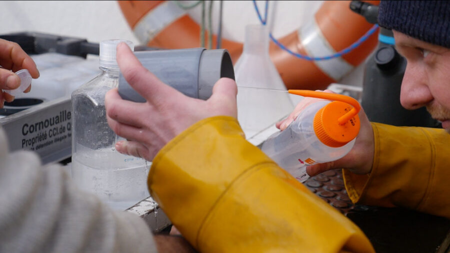 Neomysis est le nom du navire dédié aux activités liées à l’observation, la recherche et l’enseignement dans les domaines de l’écologie marine et de l’océanographie. Lors de sa résidence à la Station Marine de Roscoff, Christine Laquet a pu participer à deux missions, dont SOMLIT qui suit l’évolution des écosystèmes côtiers et littoraux. Dans son film, Laquet se concentre sur les outils de mesures et la gestuelle rigoureuse et chorégraphique des scientifiques qui collectent des organismes marins.