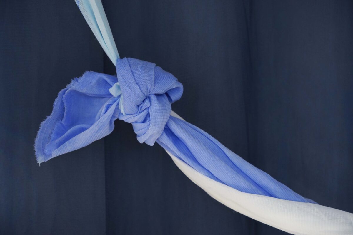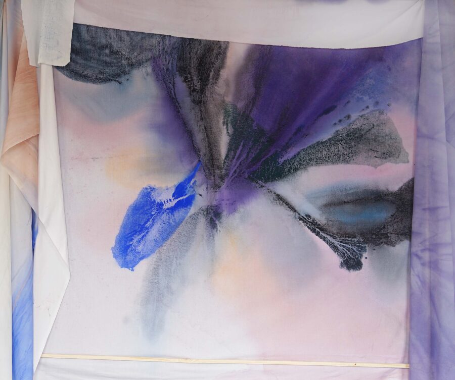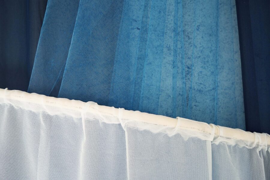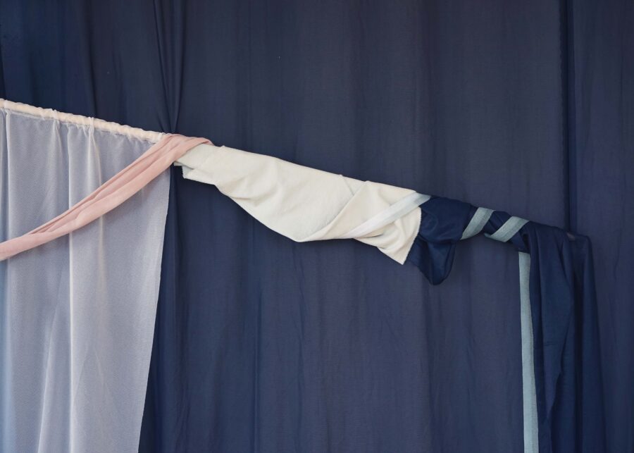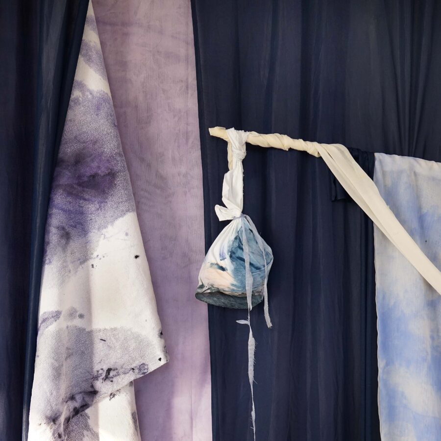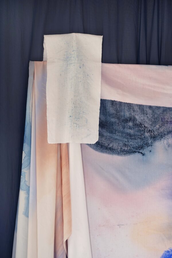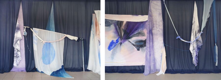 Pour ma première exposition personnelle, Nuit de la Mer, j’ai présenté une installation dans laquelle les peintures se mettent en scène. Un décor de tissus bleu nuit sert de toile de fond à une série de peintures protéiformes. Du rebut au châssis entoilé, du tulle froissé à la monochromie d’un drap teinté, Nuit de la mer est une exposition dans laquelle la peinture se déploie, pour devenir une scénographie à part entière. C’est une fresque souple et aérienne, un ailleurs dédié à l’expérience sensible de la lenteur, à la poésie de la contemplation.