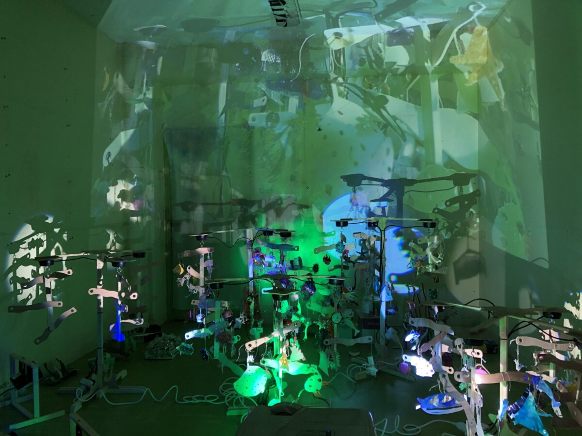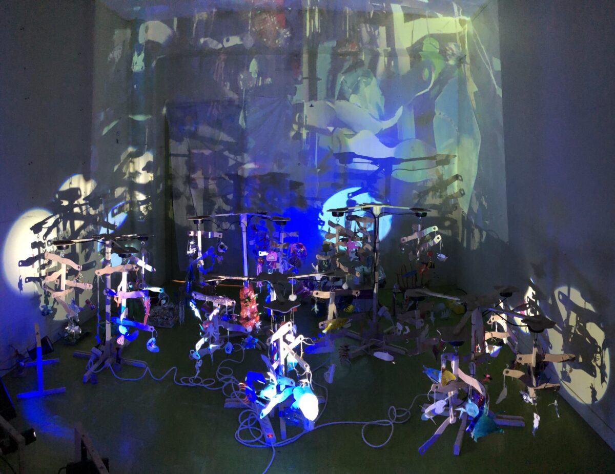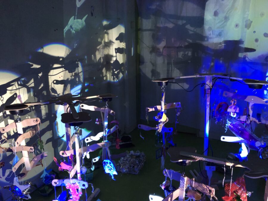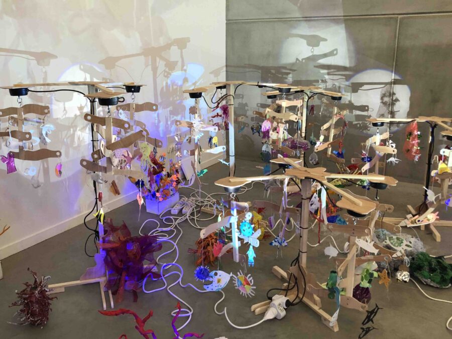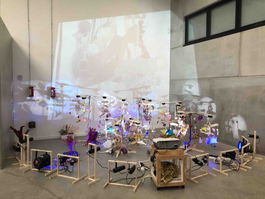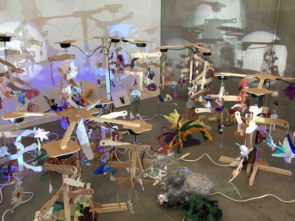 Installation créée avec tous les 6emes du collège de Cormery (37) , de 180 découpages pour ombres chinoises ( Matériaux mixtes). Une mise en mouvement par triple-modules