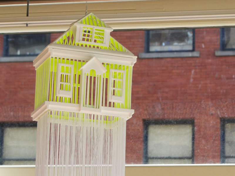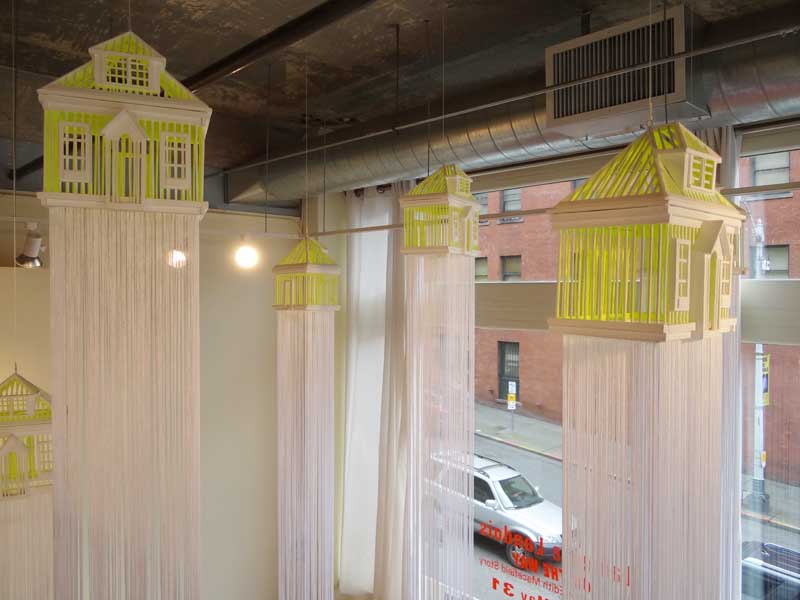 Quand je me suis rendu la première fois à Seattle en 2012, j’ai été frappée par la force et l’originalité des différents types d’architectures; des bâtiments phares très modernes aux plus insolites, décomplexés appelées les Novelties. Pour mon exposition personnelle à la Room 104 Gallery programmée au printemps 2014, je souhaitais travailler à partir d’évènements survenus dans la ville. Après différentes recherches, j’ai été attirée par l’histoire d’Edith Macefield qui a fait la une des journaux en refusant de vendre sa maison à des promoteurs agressifs. Avec sa seule volonté, Edith Macefield a su conserver sa chère maison fragile en bois résistant aux attaques ravageuses du béton qui l’a encerclée.