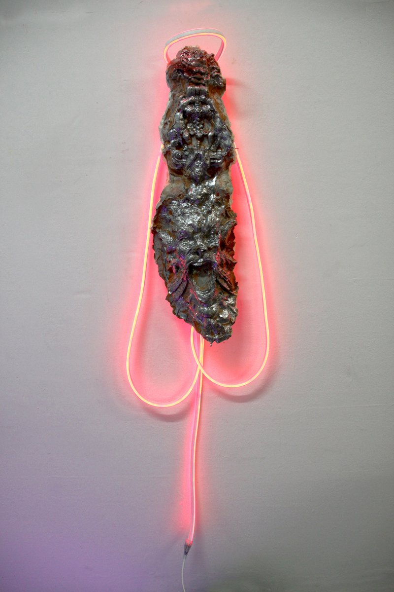Voleur, un peu, infatigable marcheur et aventurier, surtout, Jean-Baptiste Janisset parcours la France et le monde à la recherche d’objets cultuels et patrimoniaux, de « témoins », dit-il, de ce qui fédère les espaces traversés : leurs histoires, leurs mémoires, leurs croyances. Avec ou sans autorisation, il les badigeonne de vinamold ou d’argile, pour en conserver les empruntes, qu’il appelle des « révélations ». Le geste est rapide, la prise imparfaite ; « ce que ces témoins veulent bien me donner ». De ces moules, enfin, Jean-baptiste Janisset réalise les positifs, des mues grossières, difformes. Des « stigmates », qu’il expose ensuite en des compositions syncrétiques, pop et colorées, associant là les pieds et un détail du mouton tirés d’un Saint Jean-Baptiste de la cathédrale de Nantes, des motifs de soleil venant d’une église à Bastia, une tête de lion prise à Marseille, des os de mouton moulés lors de la fête de l’Aid en Algérie (Saint Jean- Baptiste, 2018).