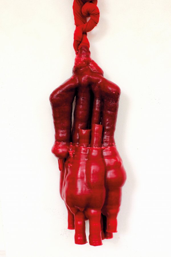 Plonger, égoutter, solidifier, rigidifier, superposer, accumuler, répéter, découper, séparer, modifier, assembler, transformer… Le processus gestuel devient presque chirurgical face à la matière qui passe de l’état liquide à l’état solide. Le textile en torsion semble dégorger du liquide, dans un processus de coagulation.