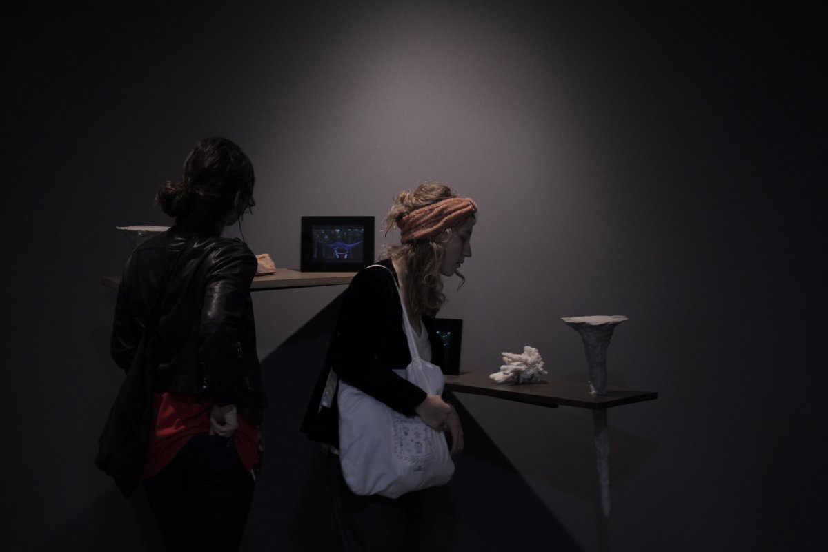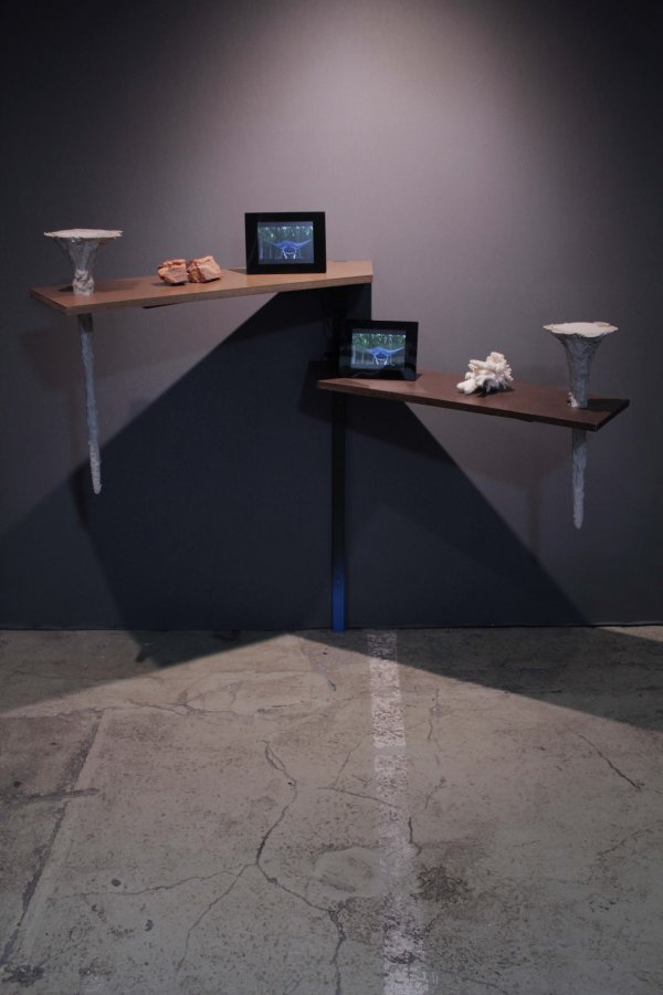 Cette sculpture se déploie comme un présentoir, recueuillant 2 stalagtites en béton, un morceaude corail blanc, un morceau de bois pétri é et l’image d’une raie manta grandeur nature réali- sée en résine par un sculpteur animalier. Autantd’objets qui cherchent leur statut entre curiositésprécieuses et représentation, vivant et minéral,millénaire ou façonné à la hâte.