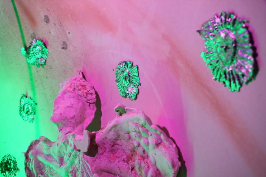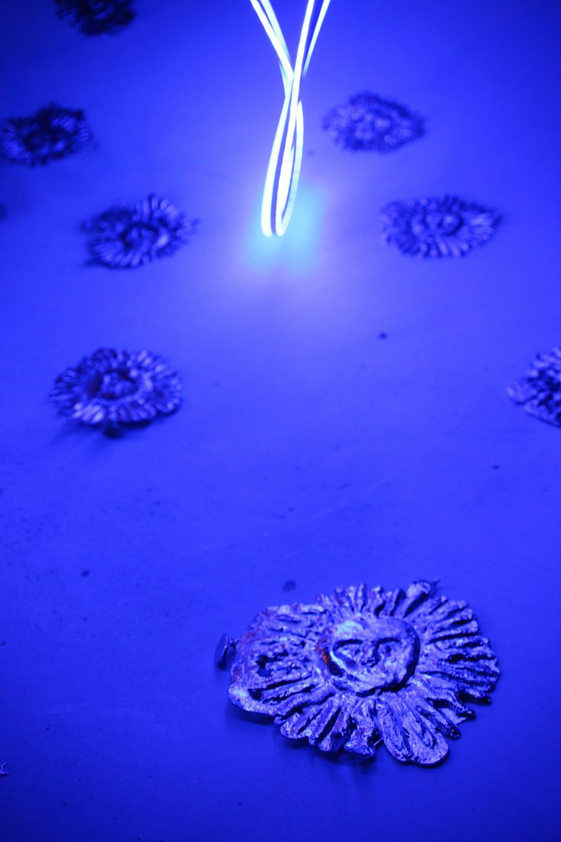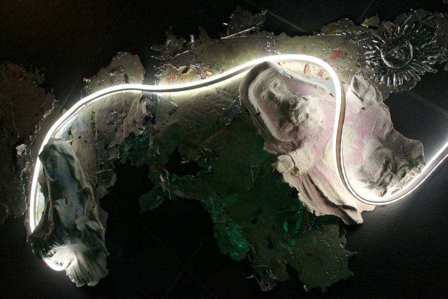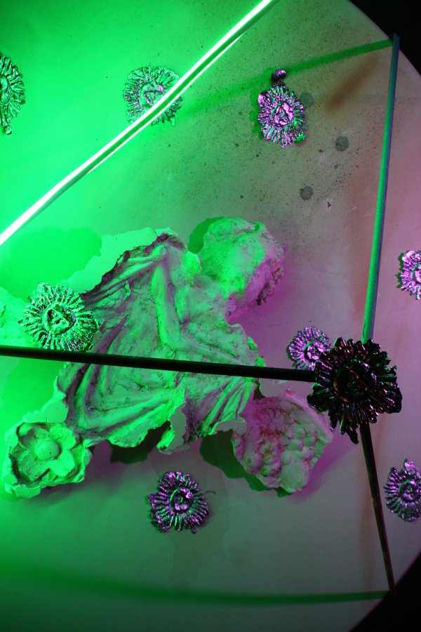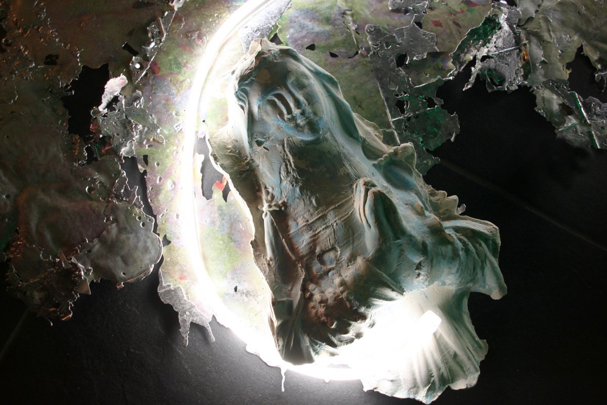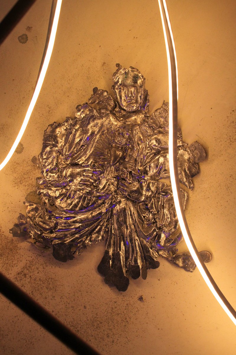 Avec ces différents éléments contextuels à l’esprit, Jean-Baptiste Janisset a sillonné le territoire corse à la recherche de multiples représentations de la Vierge Marie, de l’église Saint-Roch à Ajaccio au cimetière de Venaco en passant par le couvent Saint-François de Pino, l’église Sainte-Julie de Nonza ou encore à Ersa, à la pointe du Cap Corse. Extraites de leur environnement d’origine, les empreintes réalisées en plâtre ou en métal se parent d’une présence auratique propre : loin d’être des répliques fidèles et minutieuses, elles se laissent au contraire guider par les réactions plastiques des matériaux utilisés pour mieux en manifester l’essence même, que des transferts de photographies de bouquets de fleurs prises elles aussi dans les églises et les cimetières de l’île viennent accentuer. Au milieu de ces représentations de la Vierge Marie, Pasquale Paoli pourrait faire figure d’intrus, si ce n’était l’étroite imbrication du religieux et du politique dans le passé corse. Élu général en chef de la Nation corse en 1755, Paoli est le rédacteur de la constitution corse, première de l’histoire moderne, qui fit de l’île un état souverain et indépendant. C’est cette même constitution qu’on retrouve dans la main du buste en bronze de Pasquale Paoli qui se trouve sur la place Porta de Sartène, dont Jean-Baptiste a également réalisé l’empreinte.